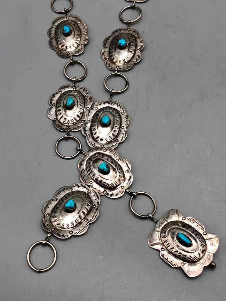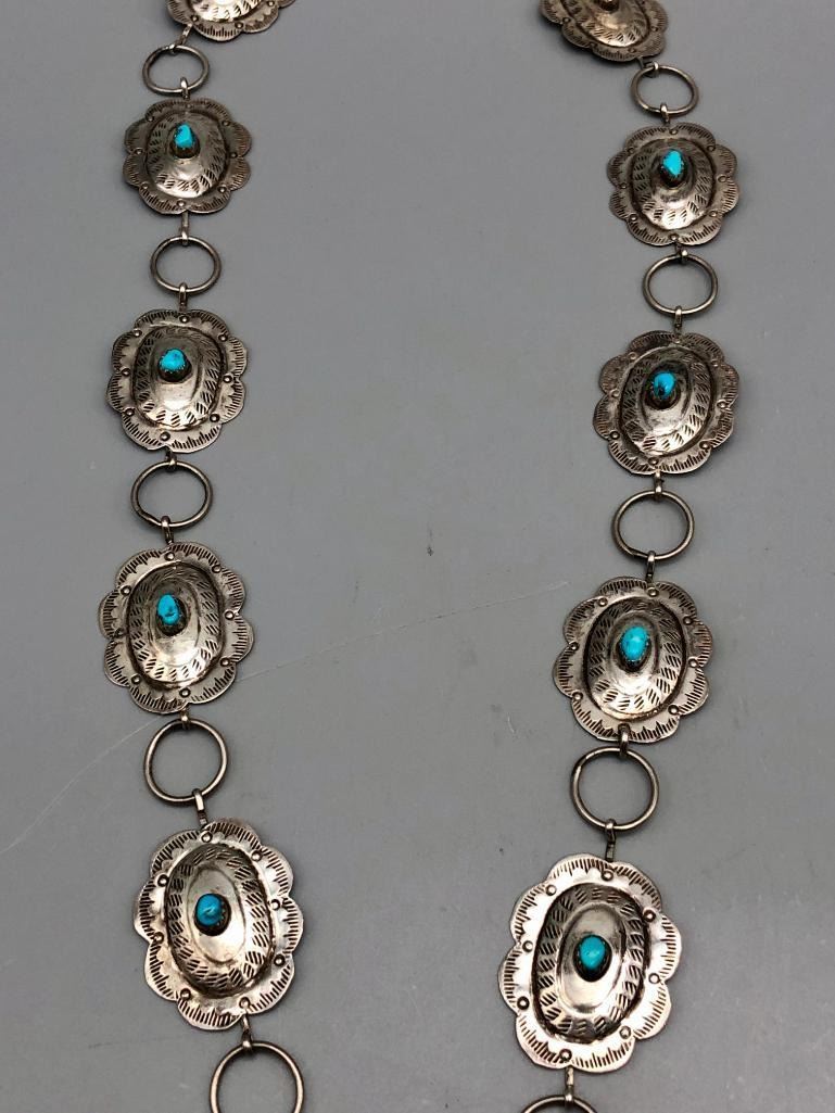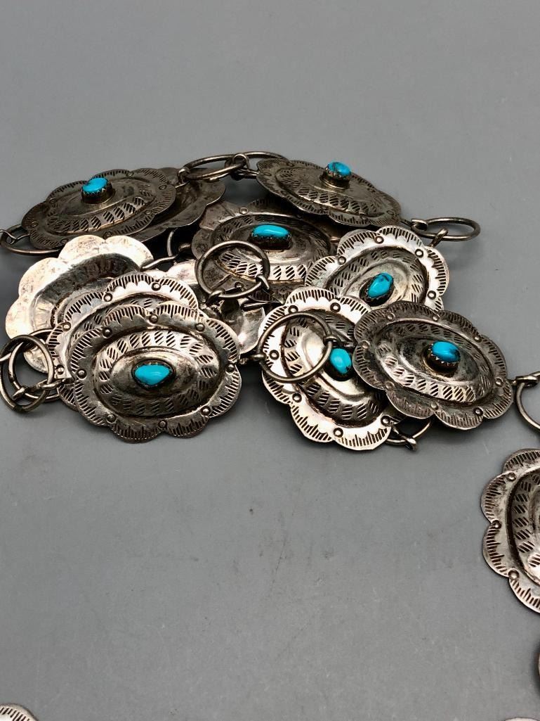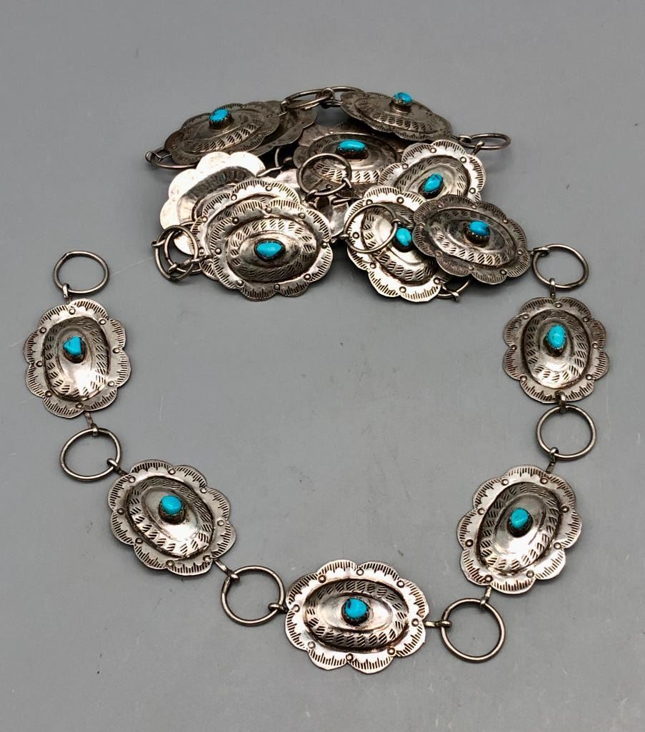 For sale in this lot is a lovely link concho belt with turquoise and sterling silver. This is a beautiful, dainty belt that is set with small turquoise stones on each concho. It features hand stamped designs around each setting and is stamped as sterling. MAKER: Hallmarked FC. APPROX AGE: Vintage. SIZE: 38-3/8 inches long X 1 inch wide. Weighs 63.6 grams. CONDITION: Good for its age, normal wear expected. Please look closely at the pictures as they are an important part of our description and are hereby incorporated into the description, specifically with regards to condition. SHIPPING: There will be a $5 handling / packaging fee for shipping this lot. The actual cost of postage will be added on top of that. BUY IT NOW: If you would like to buy this item now, without waiting for the auction day to bid on it, we do offer this option (which is available up to 48 hours before the actual auction starts). The “Buy it Now†price is the high estimate of this lot (plus applicable fees and the Buyer's premium is discounted to 10% when using the Buy it Now option). If you would like to exercise this option, you must contact us by email (or phone as long as you talk to someone live). Reference this lot number and your intention to "Buy it Now."
