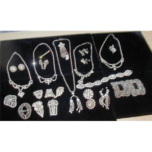 This lovely lot includes 5 Rhinestone necklaces,1 marquisite bracelet, 6 pair of earrings, 2 balls for buttons, 1 hair pin, 1 handging pin,5 art deco dress clips (one has a loose back), and several deco shoe clips. There are some stones missing from the dress clips. Buyer pays shipping and handling costs.