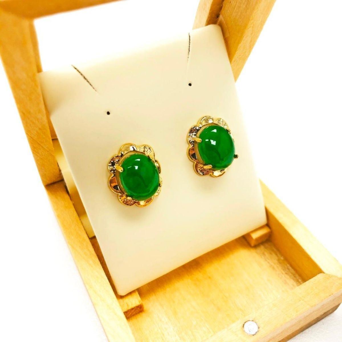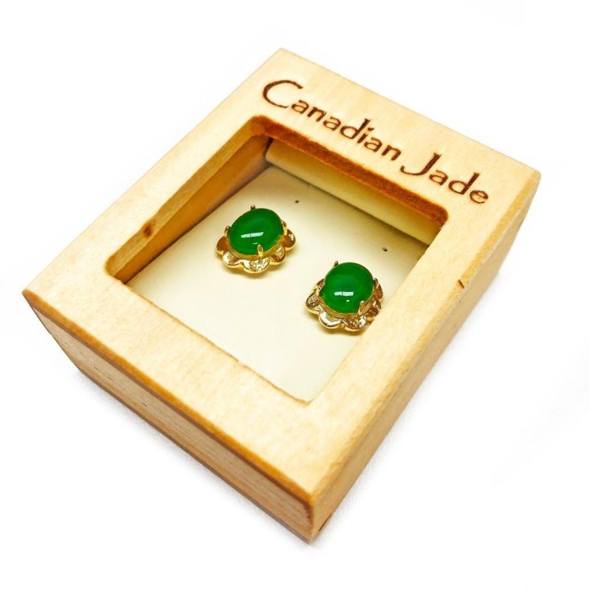Lovely Pair of Ladies 1.51ct Oval Cut Canadian Jade Stone Earrings in 18KT Gold Plated Floral Mount Jade, the stone of heaven has been prized throughout history. A stone of mystical power, ancient civilizations valued jade as the most precious of all gemstones. The world's finest nephrite jade can be found in the Cassir Mountain Range in British Columbia, the Yukon and Alaska. This tough translucent Stone is challenging to carve, however will stand the test of time and its harsh elements.
