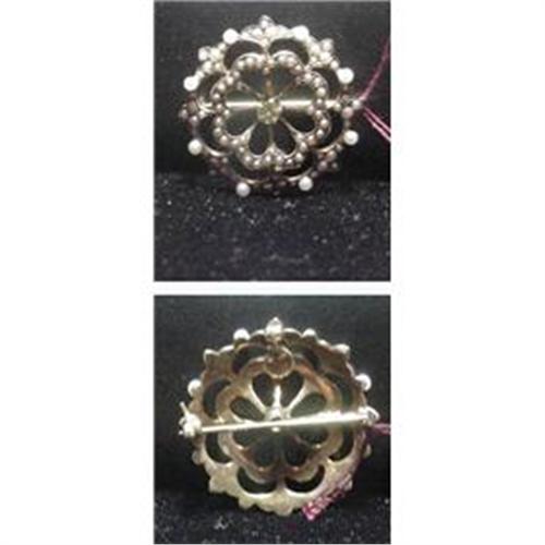 Sweet 14kt yellow gold brooch/pendant, Victorian, set with whole pearls, half pearls and one centrally prong set peridot. Lovely piece, Great condition. Original pin stem assembly and retractable bail. Call or email for more info. We accept visa/mc, by phone.