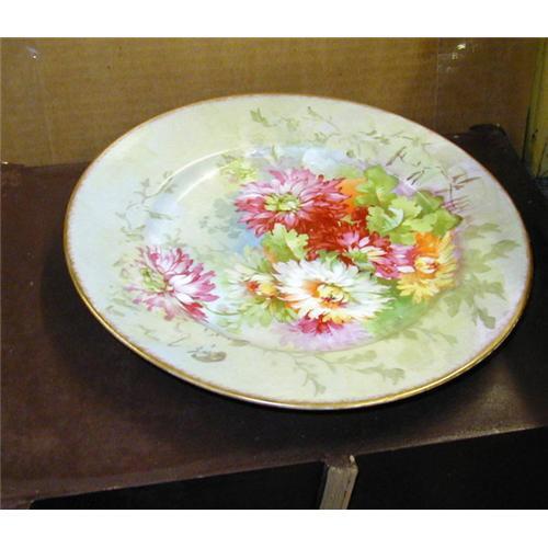 Lovely round plate signed in Green France and what I think is Lim. (Limoges)? Plate is green with pink, organge and white chrysanthemums with green leaves. Buyer pays shipping and handling costs.