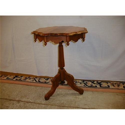 This is a beautiful round tear drop table. We believe that the wood is walnut. The top is scallop edged and the legs and base as done in a victorian style. It measures 28 1/4" tall x 20 1/4" wide x 20 1/4" deep. The weight is 11lbs. It would make a lovely addition to anyone's home.