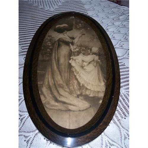 This is a beautiful picture in a sepia colored tone of a mother and her daughter picking roses.I love the color of this picture.The frame is a wood base with what seems to be a celluloid type material with a wood grain over the top.The glass is there and everything looks good.It is a nice size,measuring 27 1/2" long.