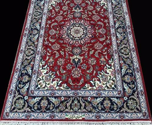 Simply Lovely Signed Super Fine Part Silk Persian Isfahan. 100%Natural, hand woven, vegetable dye, pure silk, and finest baby lamb's wool pile on pure silk foundation. This is an unbelievably lustrous fine Isfahan with a beautiful arabesque pattern on a gorgeous ruby red background with an exquisite sunburst central medallion. This fine Isfahan is woven masterfully, knot by knot, and it is signed by a renowned master weaver named "Enteshari" and it has about 400 knots per square inch. It takes a master weaver over two years to weave and create this fascinating piece. The glowing silk high lights give this lovely piece a three dimensional character. Isfahan is located in the south central part of Iran and lies at the edge of the grand desert of Iran. Isfahan is known for producing some of the finest and most beautiful rugs in the country. Size: 5 feet 4 inches X 3 feet 6 inches. Country of origin: Iran.