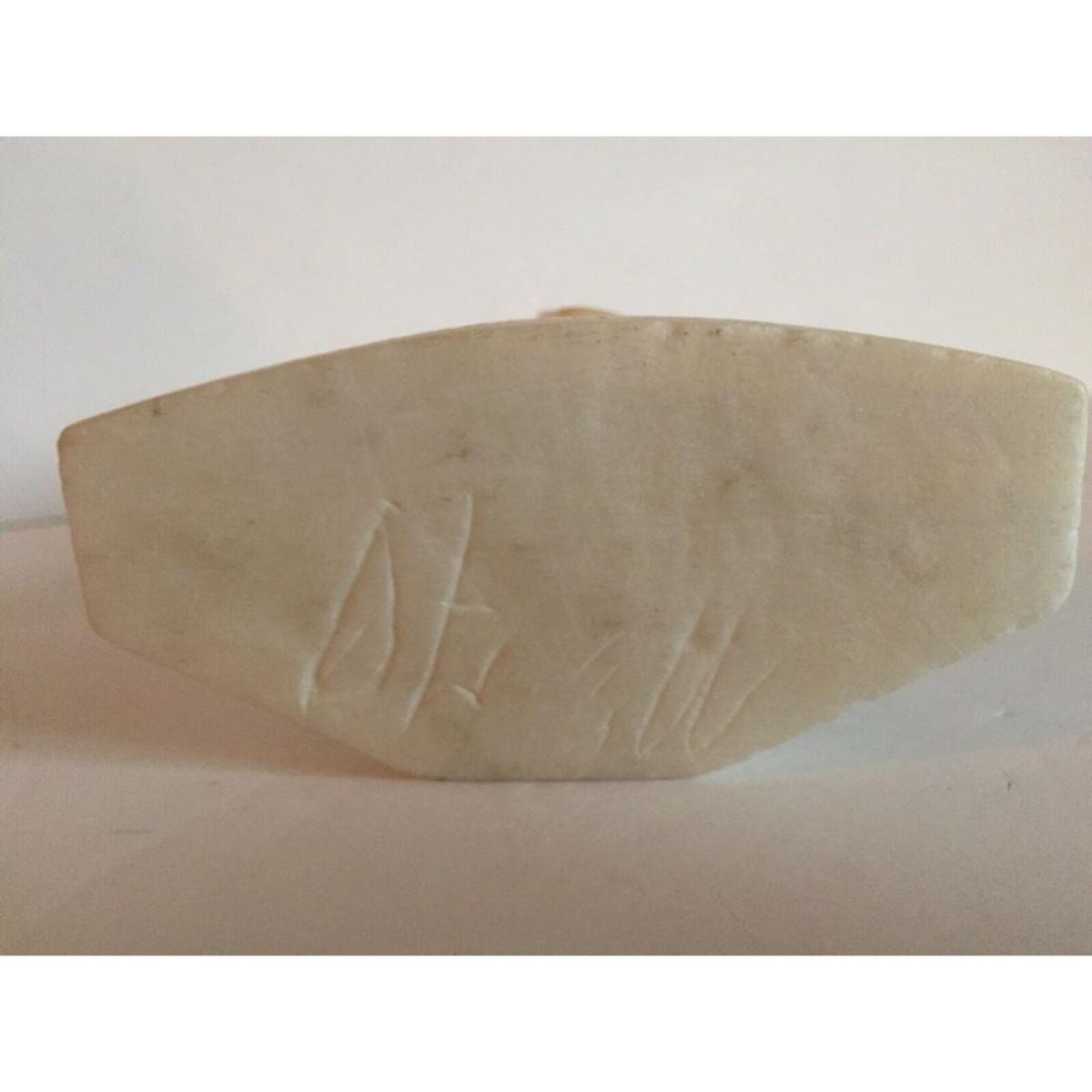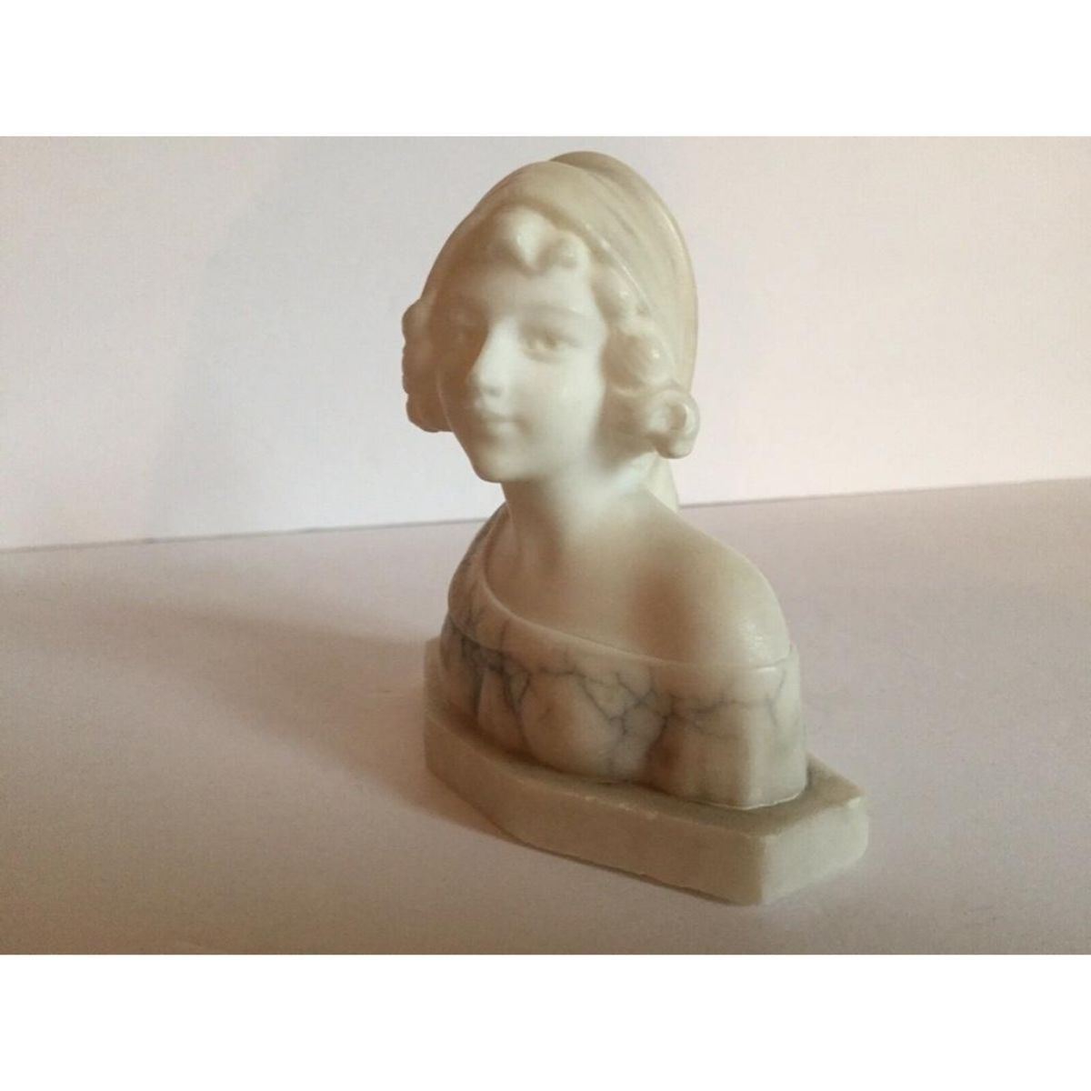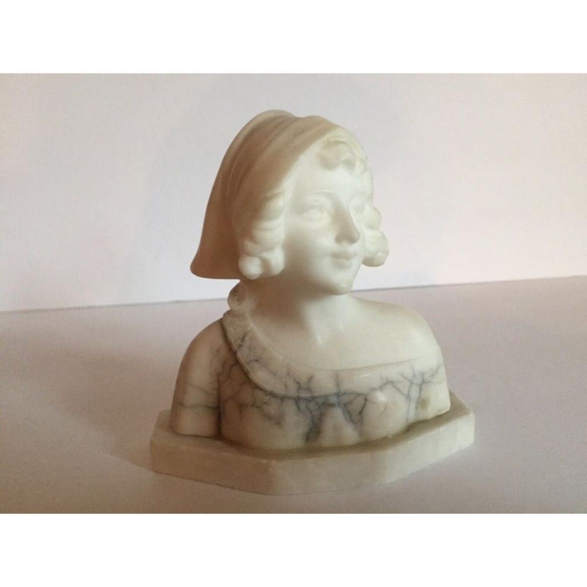 Lovely small Italian carved alabaster statue, bust of a young girl. "Made in Italia" carved on the backside base, & artist signed on the bottom. 4 1/2".