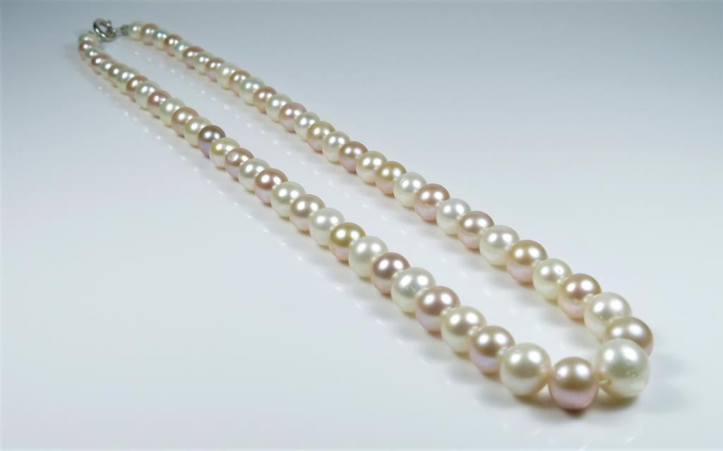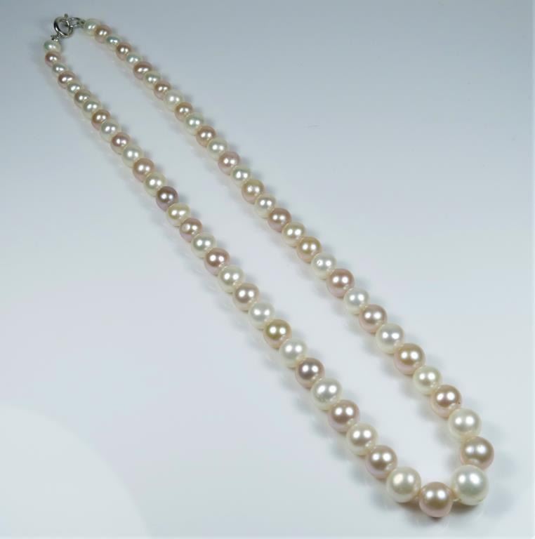 Lovely Strand of Blush and White Colored Pearls featuring a graduating 6.00 MM to 10.00 MM in diameter of lovely mixed color combination. Estimates $400-$600