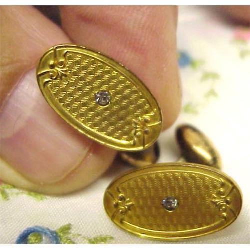Gorgeous antique cufflinks with what it looks industrial diamond in each and detail engravings and scrollings - Each cufflink is marked but i can not read it - I do think that they are gold top and the rest plated - LOVE THE STYLE!., - Excellent condition - Each measures 3/4 inch in diam. - US Buyer to pay 8.00 for insured shipping - We accept Paypal, Visa, Master Card or Money Order - Thank You very much for looking!