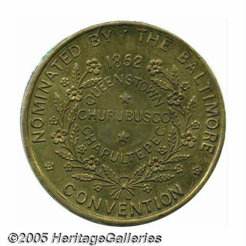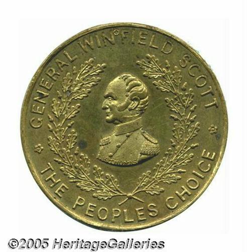 <B>Lovely Winfield Scott Campaign Token</B></I> Sullivan-DeWitt WS 1852-5 in brass, 33 mm. Although DeWitt suggests a date of manufacture past 1852, there appears to be no reason for such a medal to have been produced post election. The engraver, J. F. Thomas, produced medals for the elections of 1840 and 1844. This piece has a small circular mark at the top, indicating the position for a hole to be drilled. As DeWitt alludes to elsewhere, the market for Scott medals post election was practically non-existent, so it can be assumed there was no collector demand for such a piece. In any event, it is a beautiful piece detailing Scott's victories in war and his nomination at Baltimore. Grades uncirculated with two small tarnish spots and lovely toning. Lot:256