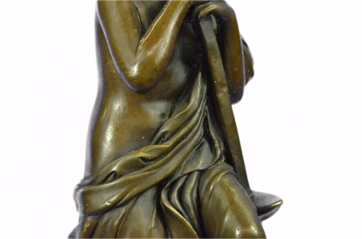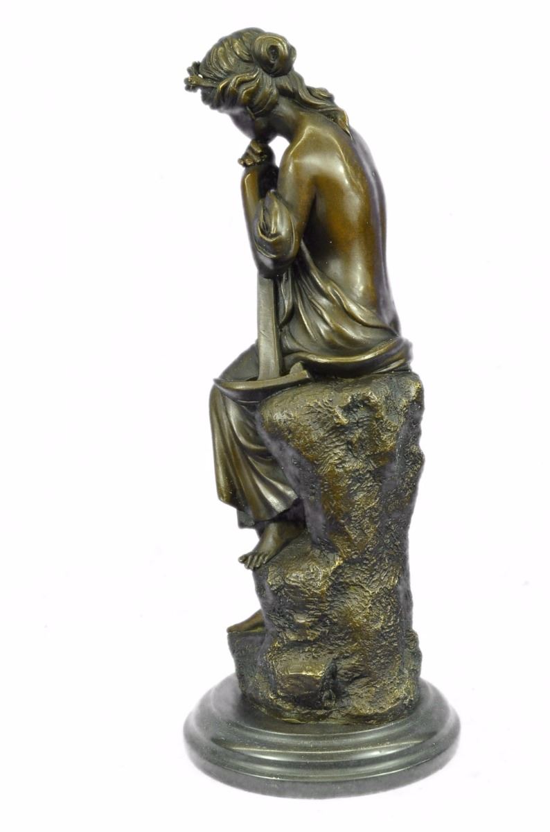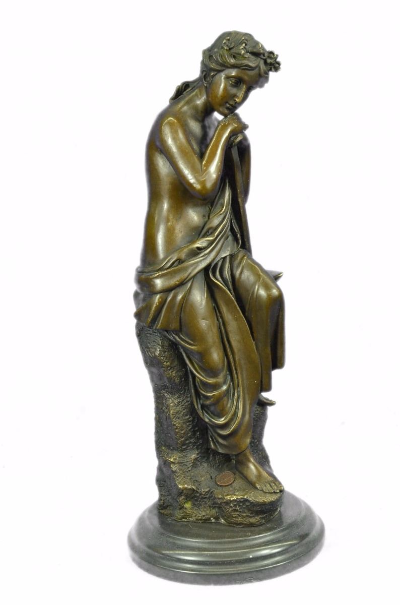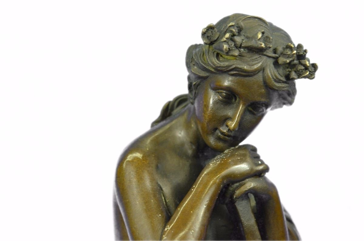 The Lovely Woman Rests Seated With Her Chin On Her Hands. She Gazes Towards The Ground In A Happy Dreamy State. Her Beauty Is A Natural, A Calm Simple Beauty. Her Wavy Hair Is Styled Down Her Back. A Crown Of Flowers Rests On Her Hair. This Sculpture Was Created Using The Lost Wax Method. It Rests On A Black Marble Base. Bronze Dimensions With Marble Base: Height 16 X Width 7 inches. Weight: 13 Lbs.