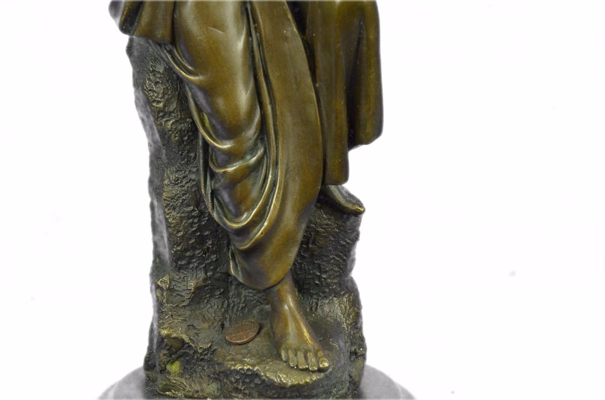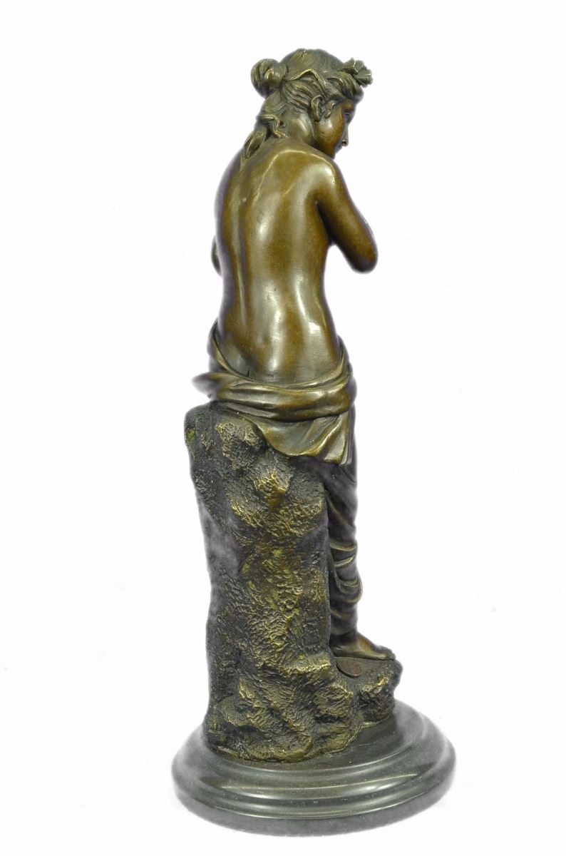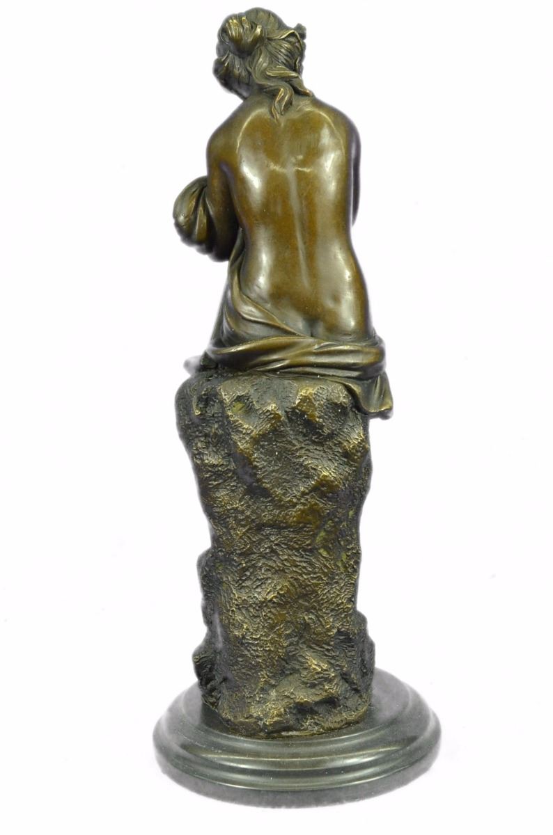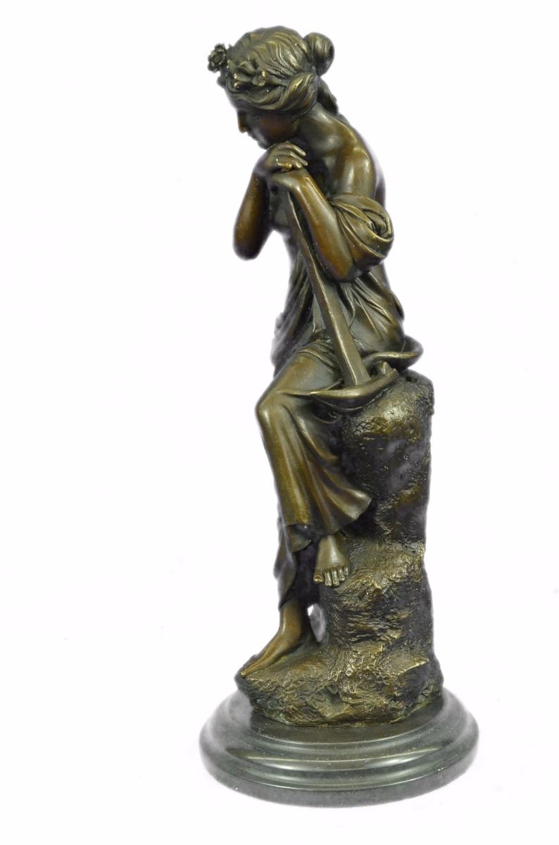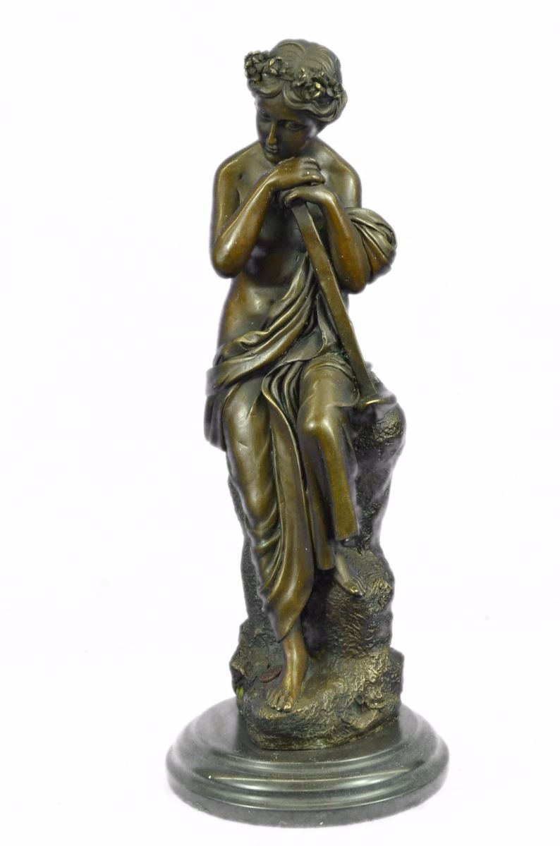 The Lovely Woman Rests Seated With Her Chin On Her Hands. She Gazes Towards The Ground In A Happy Dreamy State. Her Beauty Is A Natural, A Calm Simple Beauty. Her Wavy Hair Is Styled Down Her Back. A Crown Of Flowers Rests On Her Hair. This Sculpture Was Created Using The Lost Wax Method. It Rests On A Black Marble Base. Bronze Dimensions With Marble Base: Height 16 X Width 7 inches. Weight: 13 Lbs.