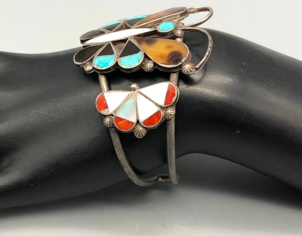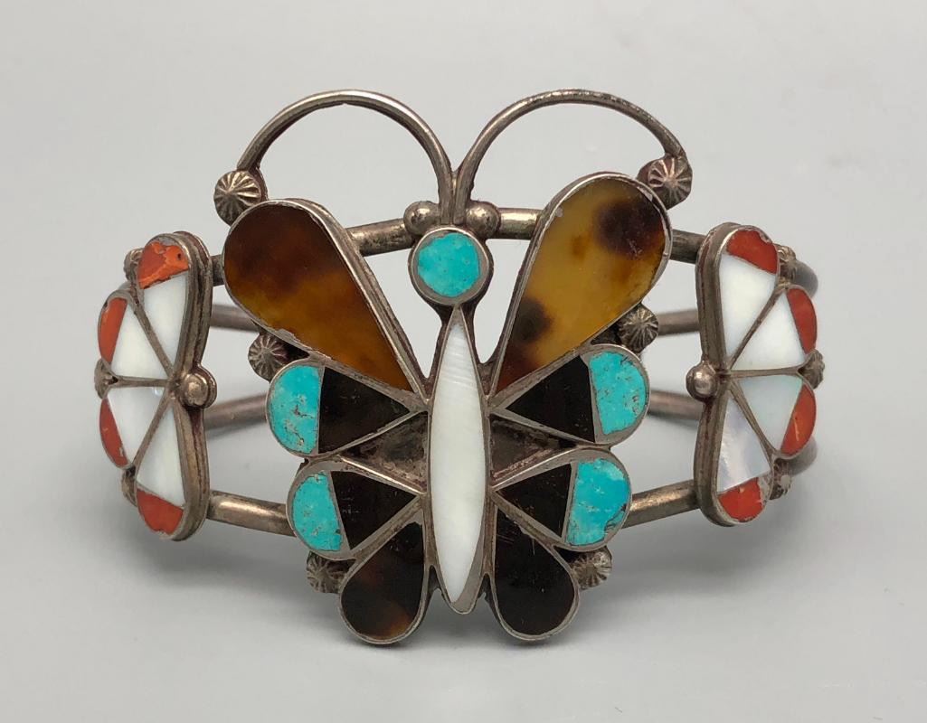 For sale in this lot is a lovely Zuni butterfly inlay bracelet. This beautiful bracelet is set with shell, coral and mother of pearl. It has an attractive yet simple design and is sterling silver. MAKER: Unmarked. APPROX AGE: Circa 1950s. SIZE: Inside circumference measures 5-5/8 inches long. Opening is an additional 1-1/8 inch, fitting a 6-3/4 inch wrist. Width is 1-3/4 inches. Weighs 32 grams. CONDITION: Good for its age, normal wear expected. Please look closely at the pictures as they are an important part of our description and are hereby incorporated into the description, specifically with regards to condition. SHIPPING: There will be a $5 handling / packaging fee for shipping this lot. The actual cost of postage will be added on top of that. BUY IT NOW: If you would like to buy this item now, without waiting for the auction day to bid on it, we do offer this option (which is available up to 48 hours before the actual auction starts). The “Buy it Now” price is the high estimate of this lot (plus applicable fees and the Buyer's premium is discounted to 10% when using the Buy it Now option). If you would like to exercise this option, you must contact us by email (or phone as long as you talk to someone live). Reference this lot number and your intention to "Buy it Now."
