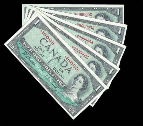 Lovely consecutive run of 5 REPLACEMENT "LOW" numbered notes. BC-37bA-I 1954 $1 *B/M0000052 to 056. Low numbers are rarely seen on replacement notes. A very attractive set! All Gems!