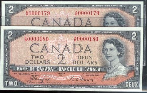 Lovely pair of consecutive "LOW" numbered notes. Both are BC-30a 1954 $2 Coyne-Towers "Devil's face" A/B0000179-180. Both are original choice uncirculated!