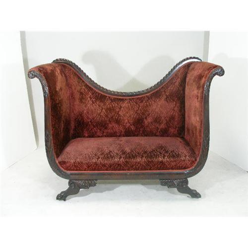 Lover's Privacy Settee, circa 1880's - Very unusual and beautiful high back love seat, mahogany frame, shaped back with gadrooned carving. Scrolled arms with rosettes and acanthus leaves, convex seat rail on cornucopia legs with paw feet. Possibly original upholstery. Dimensions - 47"h x 60"l x 24"d