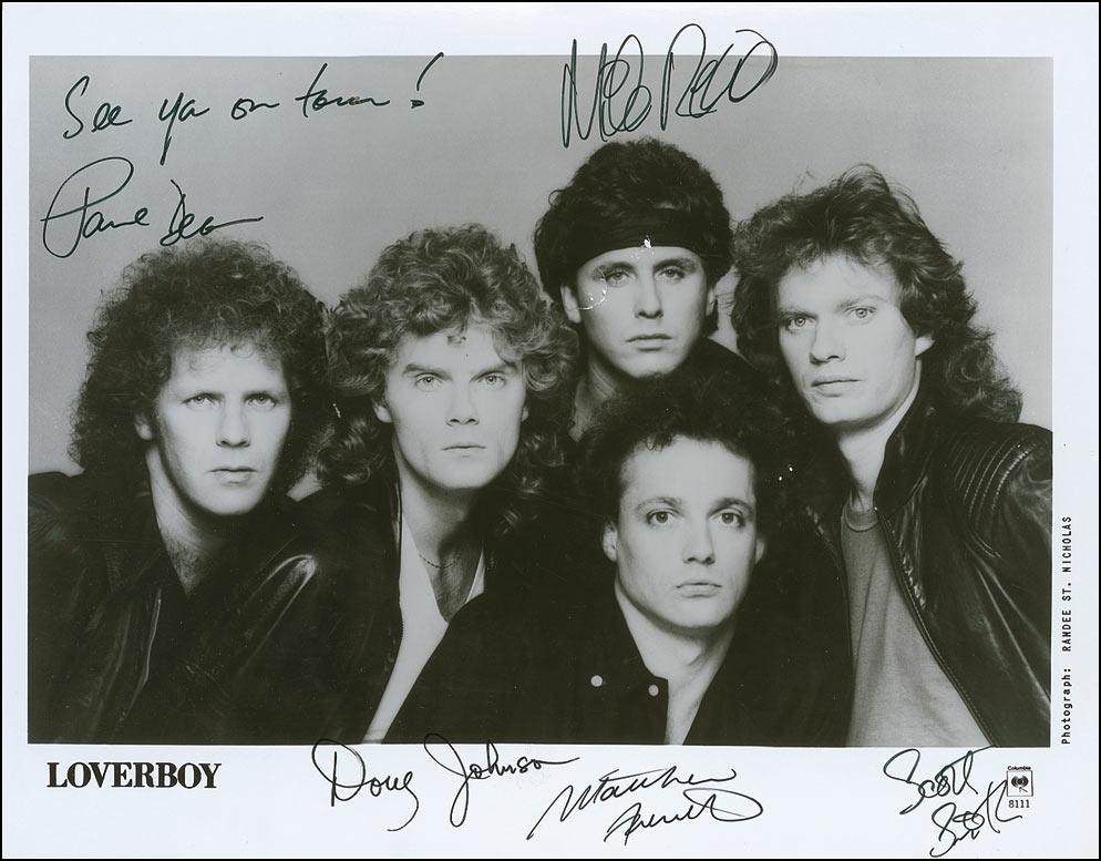 Glossy 10 x 8 Columbia Records group photo, signed in black felt tip by Mike Reno, Paul Dean, adding “See you on tour!,” Doug Johnson, Matt Frenette, and Scott Smith. In fine condition.