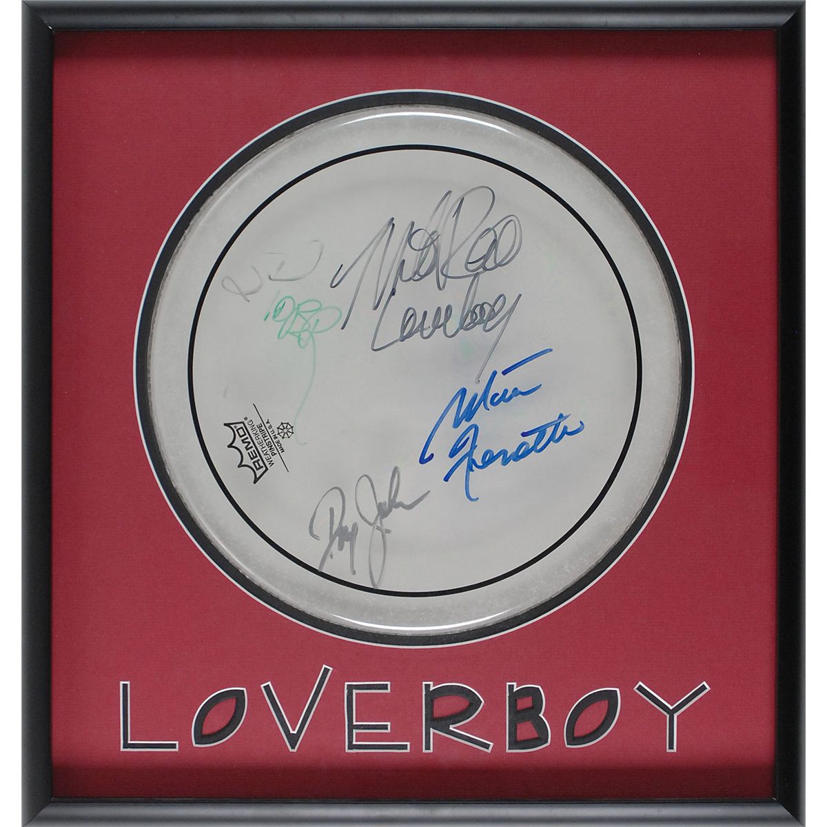 Unused clear 12? Remo drumhead, signed in various color felt tip and ink by Mike Reno, Matt Frenette, Doug Johnson, Scott Smith, and one other. Nicely double-matted and framed to an overall size of 18 x 19. In fine condition.