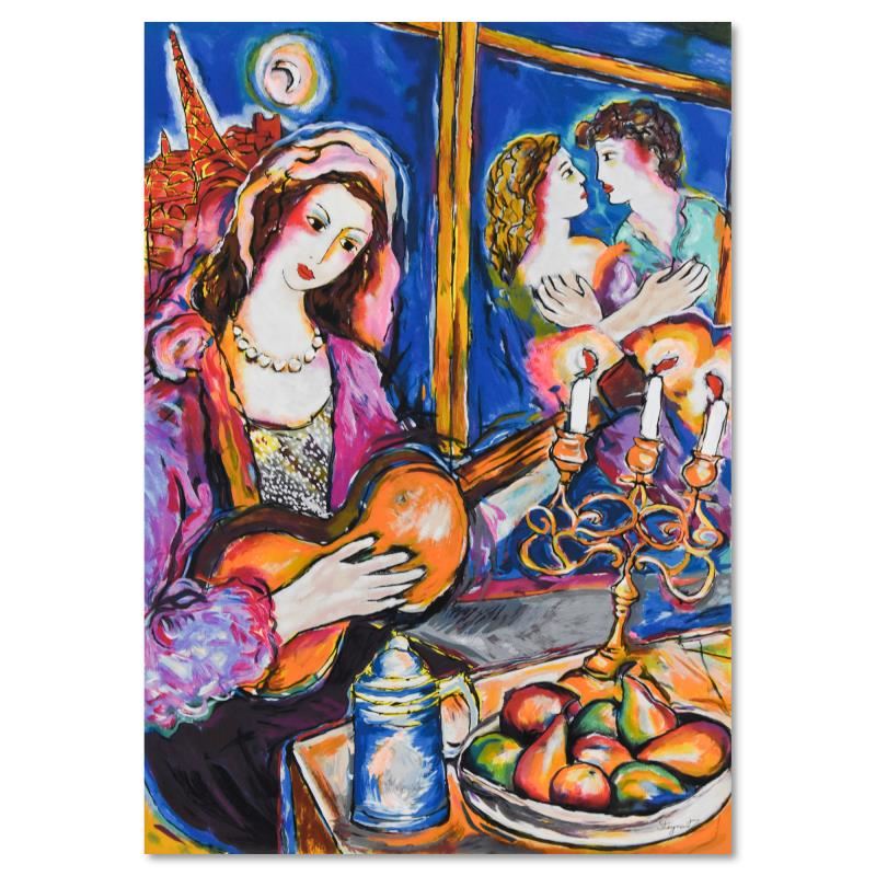 "Lovers In Paris II" is a limited edition lithograph on paper by Zamy Steynovitz (1951-2000), numbered and hand signed by the artist. Includes Letter of Authenticity. Measures approx. 27" x 37.5" (image).