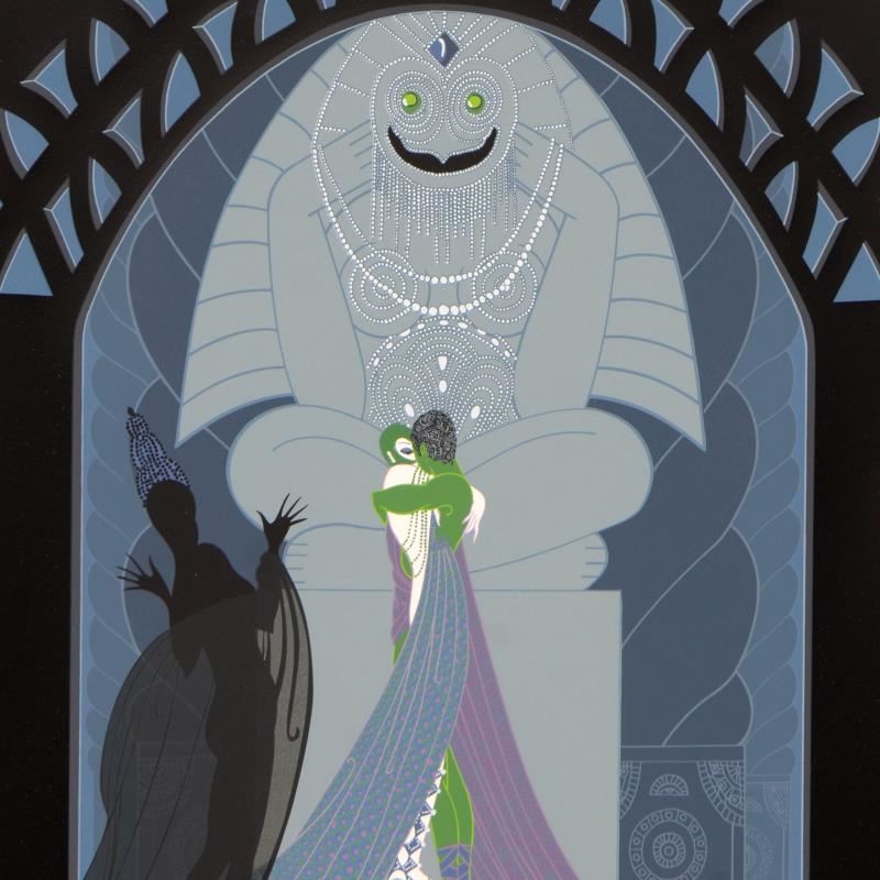 "Lovers and Idol" is a limited edition serigraph on paper by Erte (1892-1990), numbered and hand signed by the artist. Includes Certificate of Authenticity. Measures approx. 17" x 23" (border), 13" x 19" (image). Due to the age of this piece and the delicate nature of the paper it may have some slight imperfections.