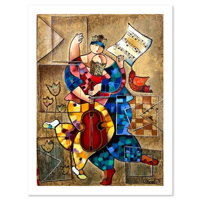 "Lovers" is a limited edition serigraph on paper by Dorit Levi. The piece comes hand signed by the artist, numbered, and with a letter of authenticity. Measures approximately 19" x 14".