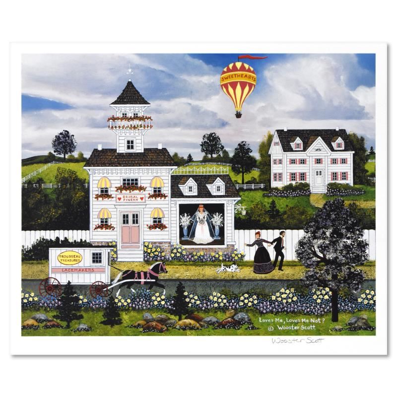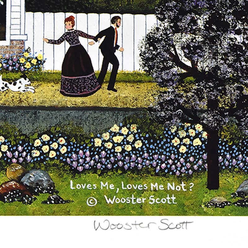 "Loves Me, Loves Me Not?" is a limited edition lithograph on paper by Jane Wooster Scott, numbered and hand signed by the artist. Includes Letter of Authenticity. Measures approx. 14.5" x 12" (border), 13.5" x 10.5" (image).
