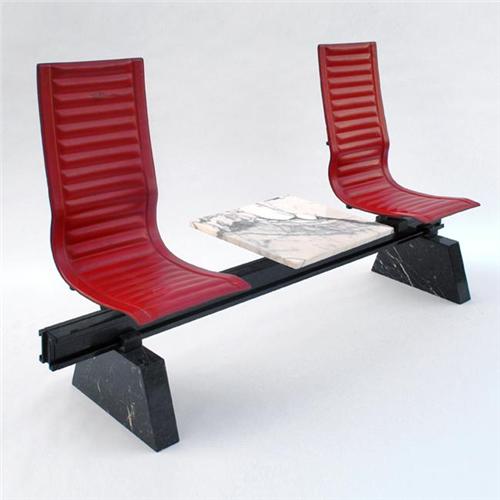 44h x 72w x 21d inches, black and white marble, red leather seats