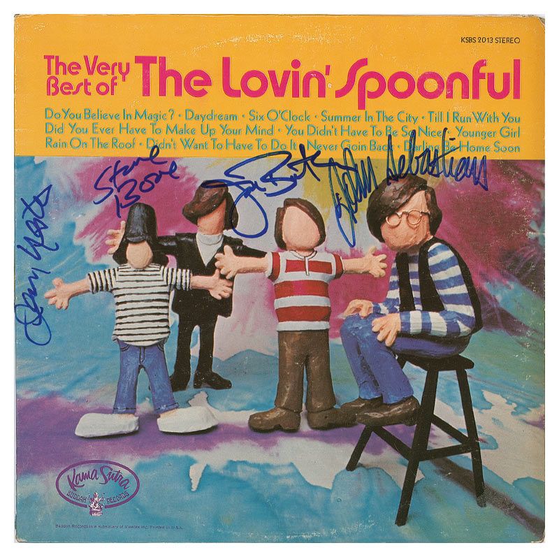 The Very Best of Lovin’ Spoonful album signed on the front in blue felt tip by John Sebastian, Steve Boone, Joe Butler, and Jerry Yester. Some mild areas of paper loss to the left edge, a uniform strip of toning on the back cover, and mild ‘rings of wear,’ otherwise fine condition. The record is not included.