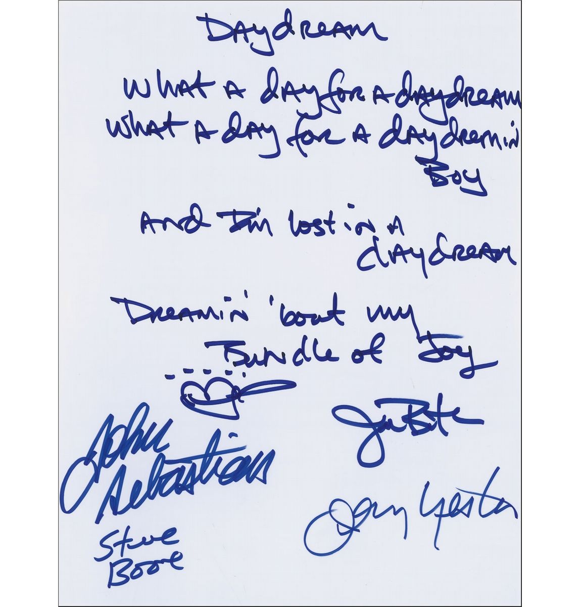 Souvenir handwritten lyrics to ‘Daydream,’ one white double-weight page, 8.5 x 11. Jerry Butler pens the title and lyrics, “What a day for a daydream, What a day for a daydreamin’ boy, And I’m lost in a daydream, Dreamin’ ‘bout my…Bundle of joy,” adding a sketch of a spoon and a heart, signed at the conclusion by Butler, John Sebastian, Steve Boone, and John Yester. In very fine condition.