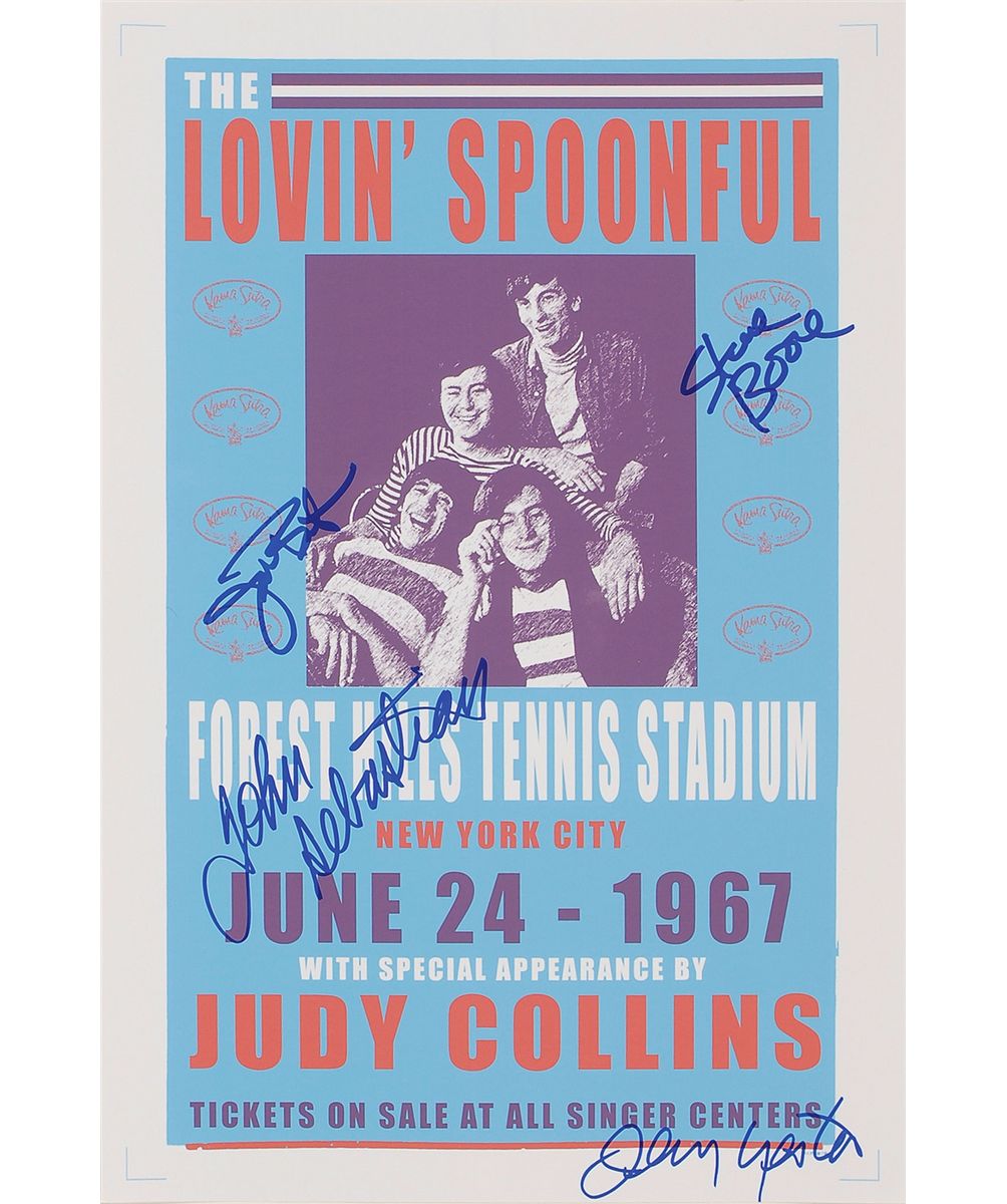 Color glossy 12 x 18 photo of a promotional poster for a 1967 New York City concert at the Forest Hills Tennis Stadium, signed in blue felt tip by John Sebastian, Steve Boone, Joe Butler and Jerry Yester. In fine condition.