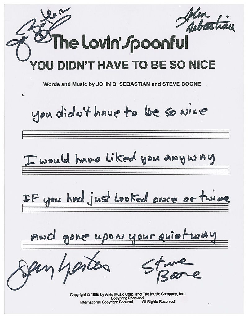 Souvenir handwritten lyrics from the beginning of the first verse of ‘You Didn’t Have to Be So Nice,’ written out by Steve Boone on an off-white 8.5 x 11 sheet of musically lined cardstock, signed in black felt tip by Joe Butler, John Sebastian, Steve Boone, and Jerry Yester. In very fine condition.