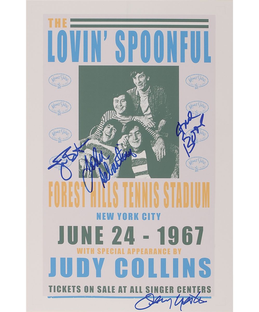 Color glossy 12 x 18 photo of a promotional poster for a 1967 New York City concert at the Forest Hills Tennis Stadium, signed in blue felt tip by John Sebastian, Steve Boone, Joe Butler and Jerry Yester. In fine condition.
