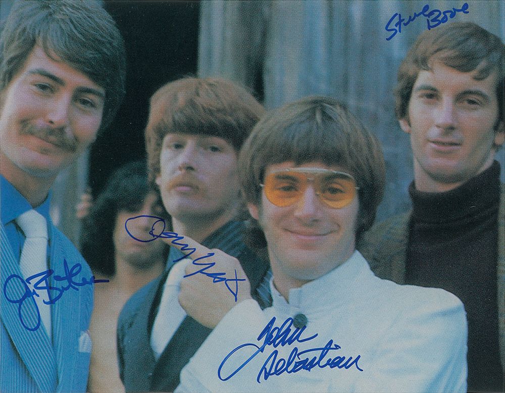 Color glossy 14 x 11 group photo, signed in blue felt tip by John Sebastian, Steve Boone, Joe Butler, and Jerry Yester. In fine condition, with some graininess to the image.