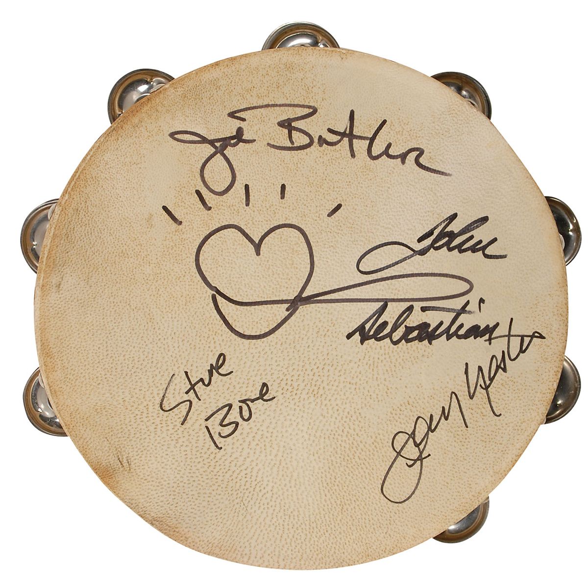 Off-white 10? tambourine, signed on the head in black felt tip by John Sebastian, Joe Butler, Steve Boone, and Jerry Yester, with Boone adding a sketch of a heart in a spoon. In fine condition, with typical slight irregularities and discoloration to skin.