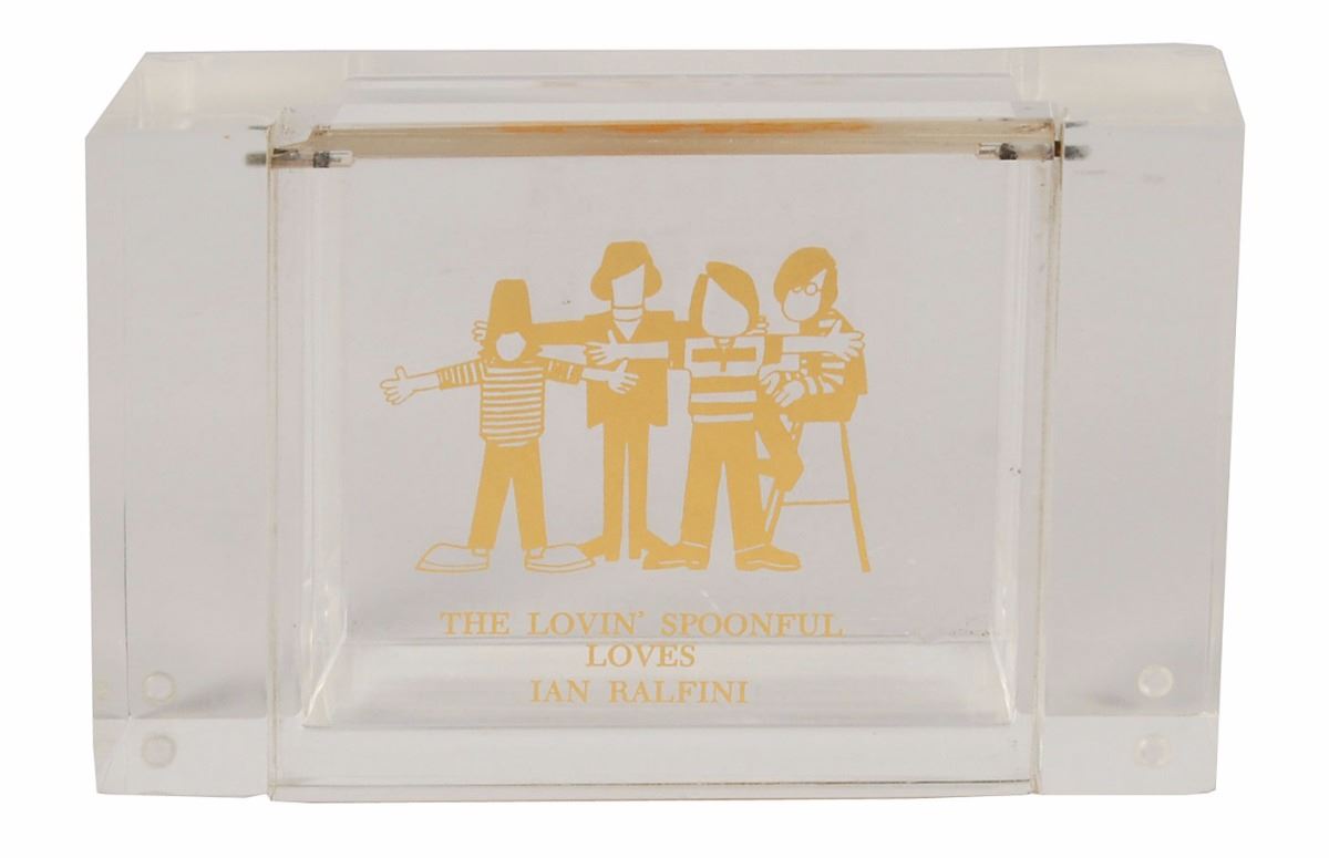 Four color semi-glossy heavyweight photos of the individual members of Lovin’ Spoonful, each approximately 7.5 x 9.5, signed in blue ballpoint by John Sebastian, Steve Boone, Joe Butler, and Zal Yanovsky (first name only), who signs again on the reverse. Also includes a transparent flip-top Plexiglas box presented to Kama Sutra record executive Ian Ralfini for the release of the 1967 compilation album The Best of The Lovin’ Spoonful. In overall very good to fine condition, with scattered creasing and a surface impression on Zal’s photo from his second signature on the reverse.