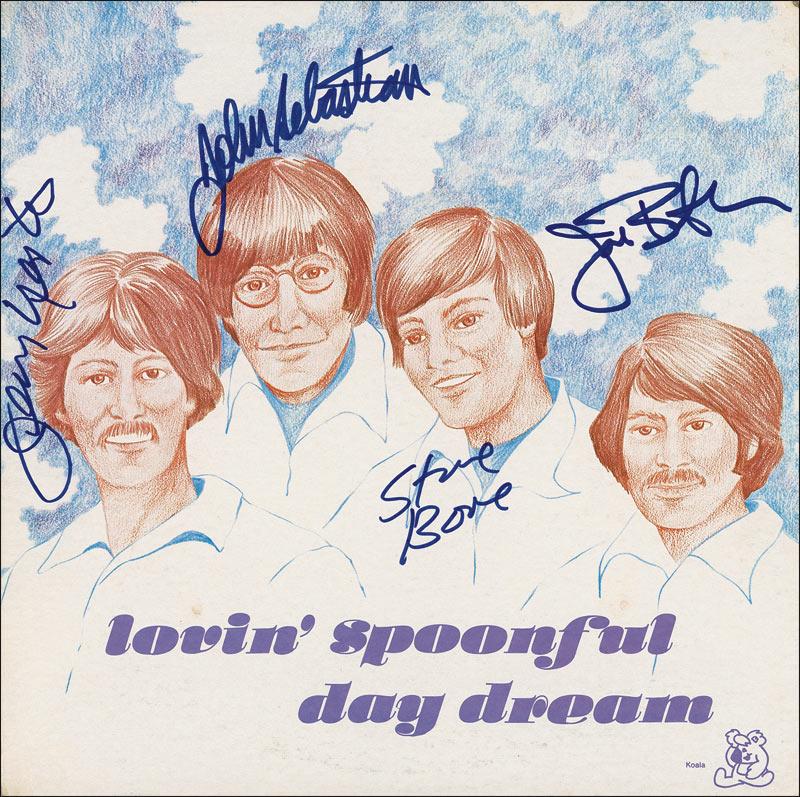 Day Dream album signed on the front cover in blue felt tip by John Sebastian, Steve Boone, Joe Butler, and Jerry Yester. In fine condition, with a bit of scattered light cover wear. The record is included.