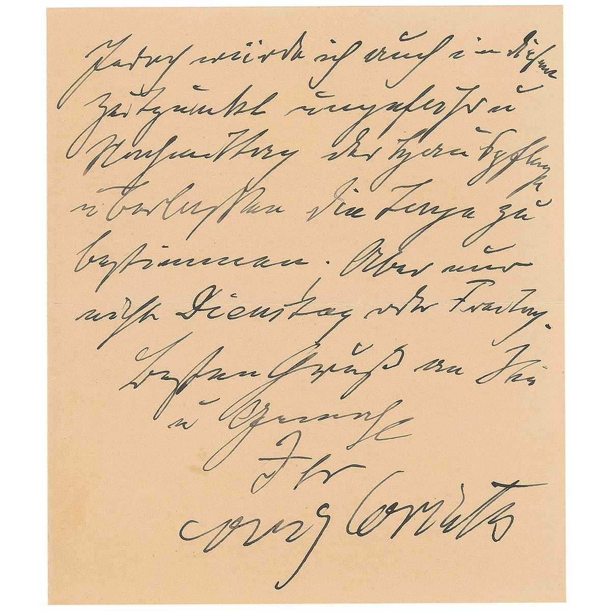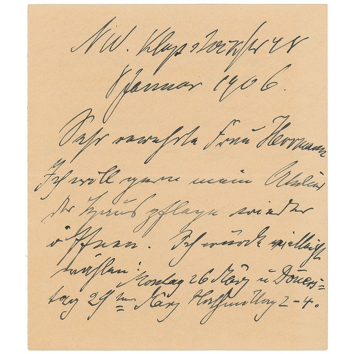 German painter and printmaker (1858–1925) whose work evolved into a union of impressionism and expressionism. ALS in German, two pages on two adjoining sheets, 5 x 6, January 8, 1906. Untranslated letter to Sophie Hermann, the wife of the painter Curt Herrmann. In fine condition, with trivial soiling.
