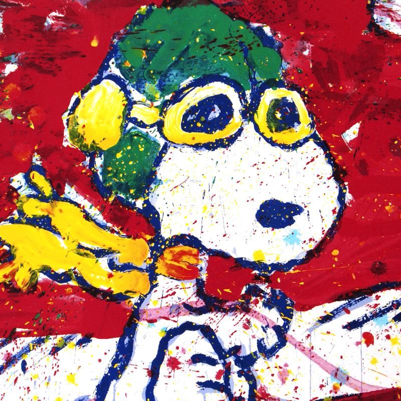 Master Artist Tom Everhart is the protege of famed "Peanuts" creator, Charles M. Schulz (1922â€"2000). As the only artist in the world granted the rights to draw the "Peanuts" characters in his own work, Everhart creates vibrant, extremely collectible rainbow masterpieces featuring Snoopy, Woodstock and the gang. "Low Fat Meal Over Santa Monica" is a limited edition hand pulled original lithograph on museum quality deckle-edge paper, numbered and hand signed by Everhart! Includes Certificate of Authenticity! Measures approx. 37" x 28.5" (with border), 33" x 24" (image). This artwork was created on one of two rare antique Marinoni Voirin lithograph presses that date back to the 1800's, and are reputed to come from the Paris print shop used by Henri Toulouse-Lautrec. There are only 7 of these magnificent beasts left in the world: the smaller one (with a print bed size of 25" x 35"), weighs 9 tons, and the larger one weighs in at 11 tons (print bed size 31" x 47"). The significance of this is that the lithographs produced by this method are of the finest quality, using techniques that are so labor and time intensive that very few master printers know how to operate and care for these presses today. Each lithograph is created with hand-mixed colors applied one at a time - a highly trained and synchronized team must hand feed each museum-quality sheet of paper through the press numerous times in order to set the colors and impressions, while the Chromist - a trained color specialist - adjusts each color by look and feel to match the original artwork, as if mixing a potion. The result is an image with maximum pigment saturation, formed through rich layers of color that imbue the artwork with a permanency of brilliance - proven over centuries to last. In contrast, today's printers use a method more akin to a dot matrix style application, with the colors all premixed and sprayed onto a sheet in a uniform layer, resulting in a much less saturated image that is susceptible to fading and imperfect color reproduction. This is one of the final Tom Everhart editions to be printed using this very special technique.