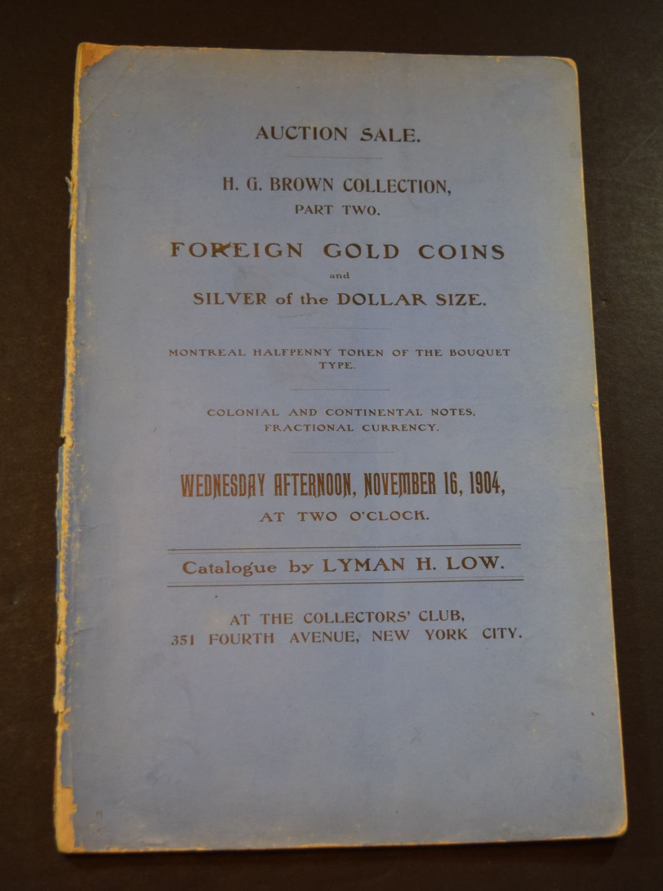 Low, Lyman H. CATALOGUE. PART TWO OF THE H.G. BROWN COLLECTION. November 16, 1904. 1-613 Lots. 12mo. This auction sale catalog includes numismatic material from the United States, Canada, Europe, Latin America, and other foreign countries from the collection of H.G. Brown. Included in the sale are Five Sovereign Pieces of England, and many of the large denominations of other countries, also Crowns, Thalers, Scudi, Piasters, and other Silver Coins of the Dollar Size and above, among which are rarities and many attractive pieces. A Supplementary Invoice Contains Canadian Coins, Etc., Including the Very Rare Montreal Halfpenny Bank Token, of The Bouquet Type, probably the first offered in thirty years, Colonial & Continental Notes, Fractional Currency, Etc. New York, original blue card covers, spine very worn, 33 pages, unplated, HMW, Adams 94: A- Oxford pound, 1826 5 sovereign pattern, AU 1806 25 cents, Breton 673, Excellent European, Gengerke 94[383]. Lot weight: 0 lbs 4oz. Subject(s): United States, Canada, European, Latin American, World Coinage.