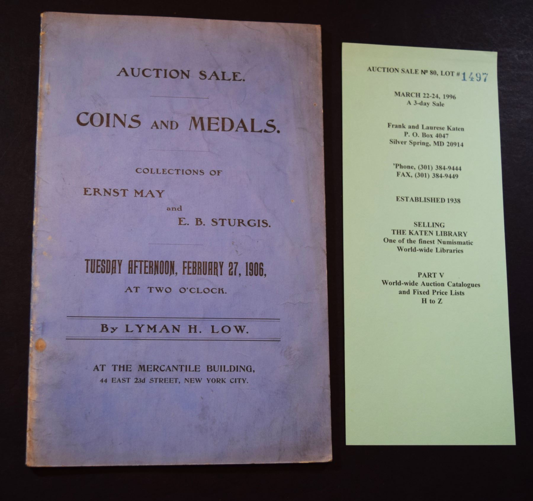 Low, Lyman H. CATALOGUE OF THE PROPERTIES OF ERNST MAY, AND THE REMAINDER OF THE COLLECTION FORMED BY THE LATE E.B. STURGIS, BOROUGH OF BROOKLYN. February 27, 1906. 1-656 Lots. 12mo. This auction sale catalog includes numismatic material from the United States, Europe, Mexico, Latin America, and other foreign countries from the collection of Ernst May and E.B. Sturgis. Included in the sale are counterstamped cob and cut money, foreign dollars, with many of the smaller coins, and generally in fine condition, copper coins, with some that are new and scarce, gold dollars and other issues of the United States, American and foreign silver and bronze medals. New York, original blue card covers, 41 pages, ex Katen Sale No. 80 Lot 1497, Adams 108: C+ Extensive Mexican, European, Gengerke 108[384]. Lot weight: 0 lbs 3oz. Subject(s): United States, European, Latin American, World Coinage.