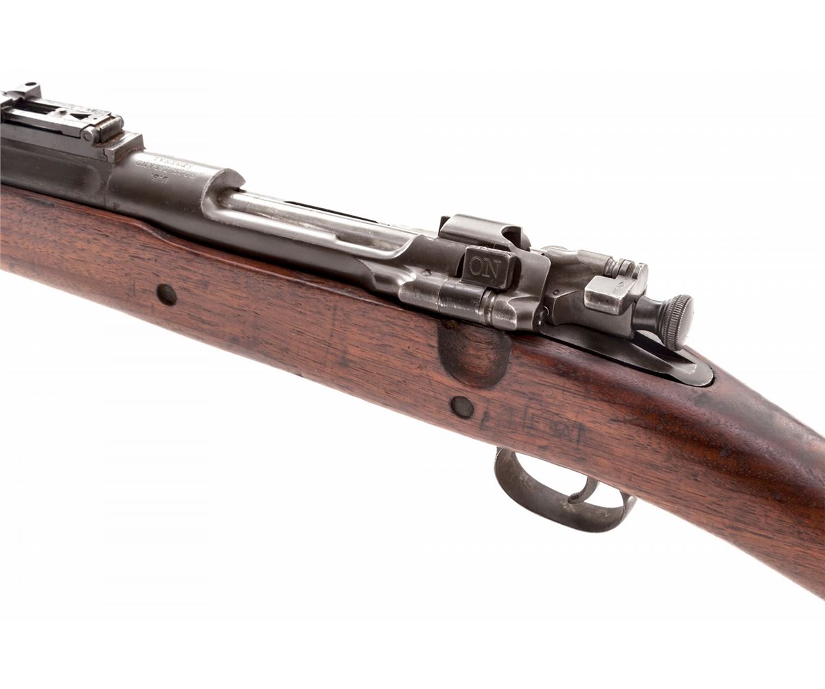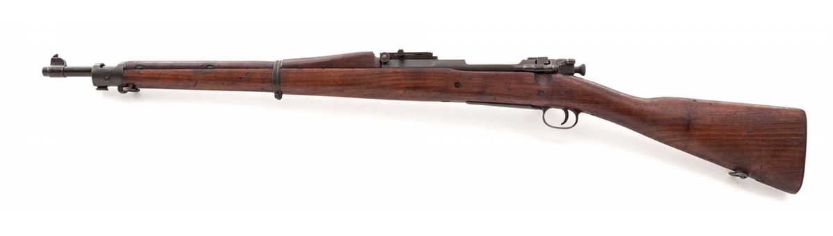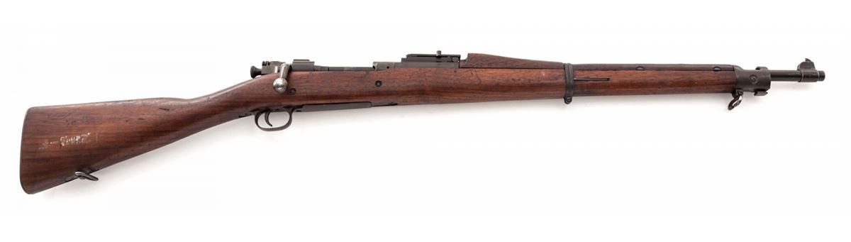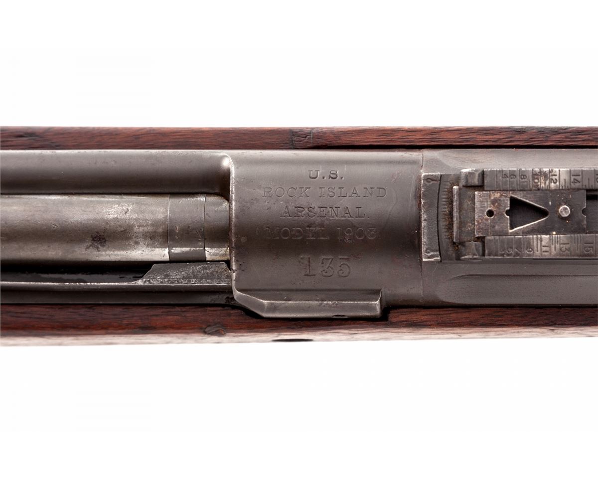 Low Numbered U.S. Model 1903 Bolt Action Rifle, by Rock Island, #135, .30-06 cal., 24'' RIA marked barrel dated 3-18, parkerized finish, later FJA cartouched double crossbolt straight walnut stock, Condition is very good to near fine as refurbished immediately following WWI, and then again during the early stages of WWII. Rifle retains approx. 95% parkerized finish. Stock with light scuffs and scratches and some oil darkening. Good action and very good bore. Est.: $600-$800. (C&R)