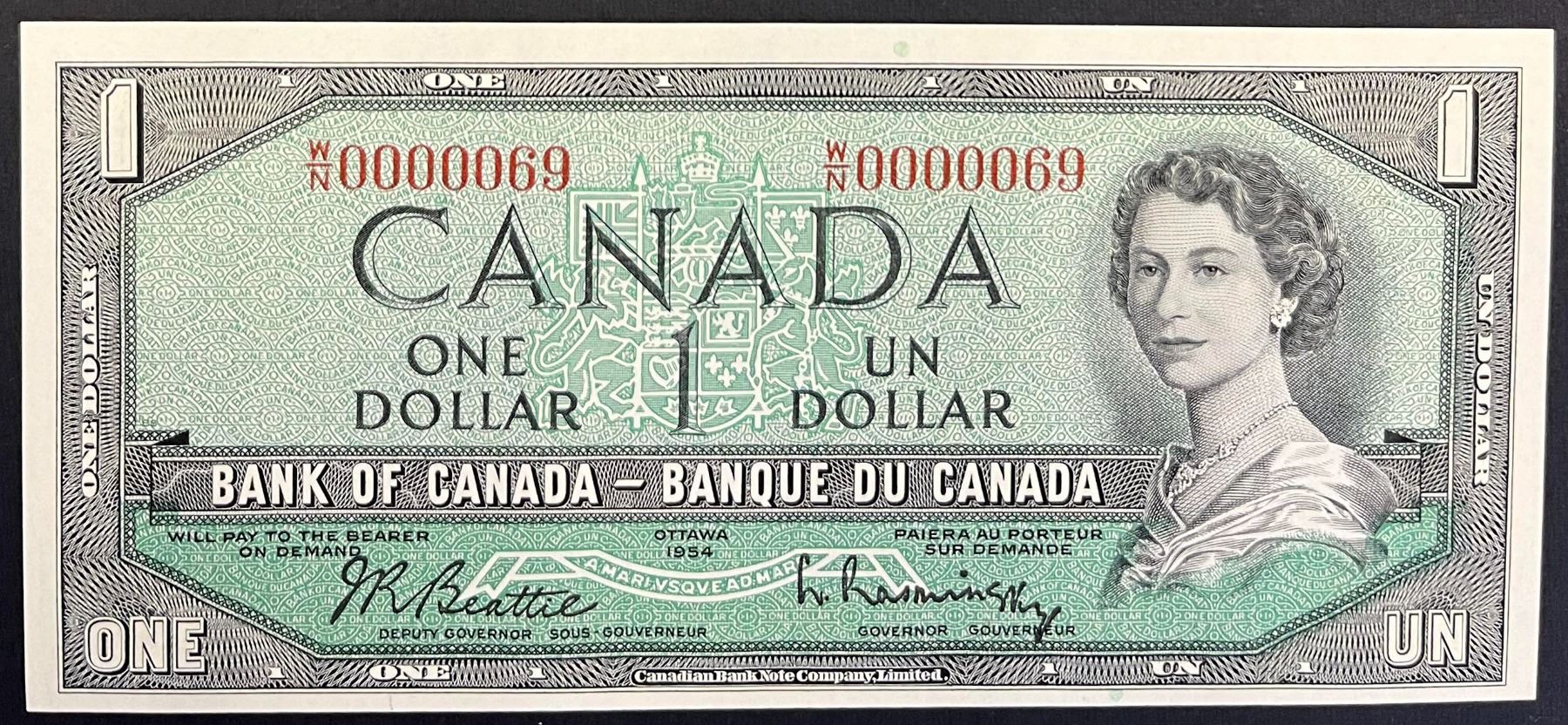 Low Number; 1954 $1 BC-37b #W/N0000069 Choice Uncirculated.