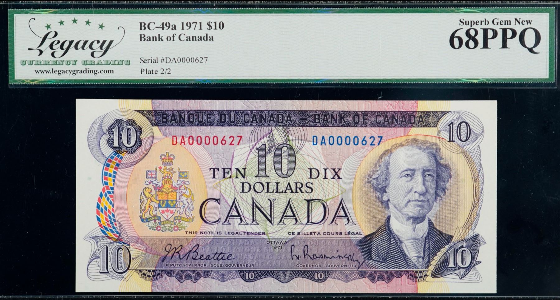Low Number; 1971 $10 BC-49a DA0000627, Legacy Currency Grading Superb Gem Uncirculated-68PPQ