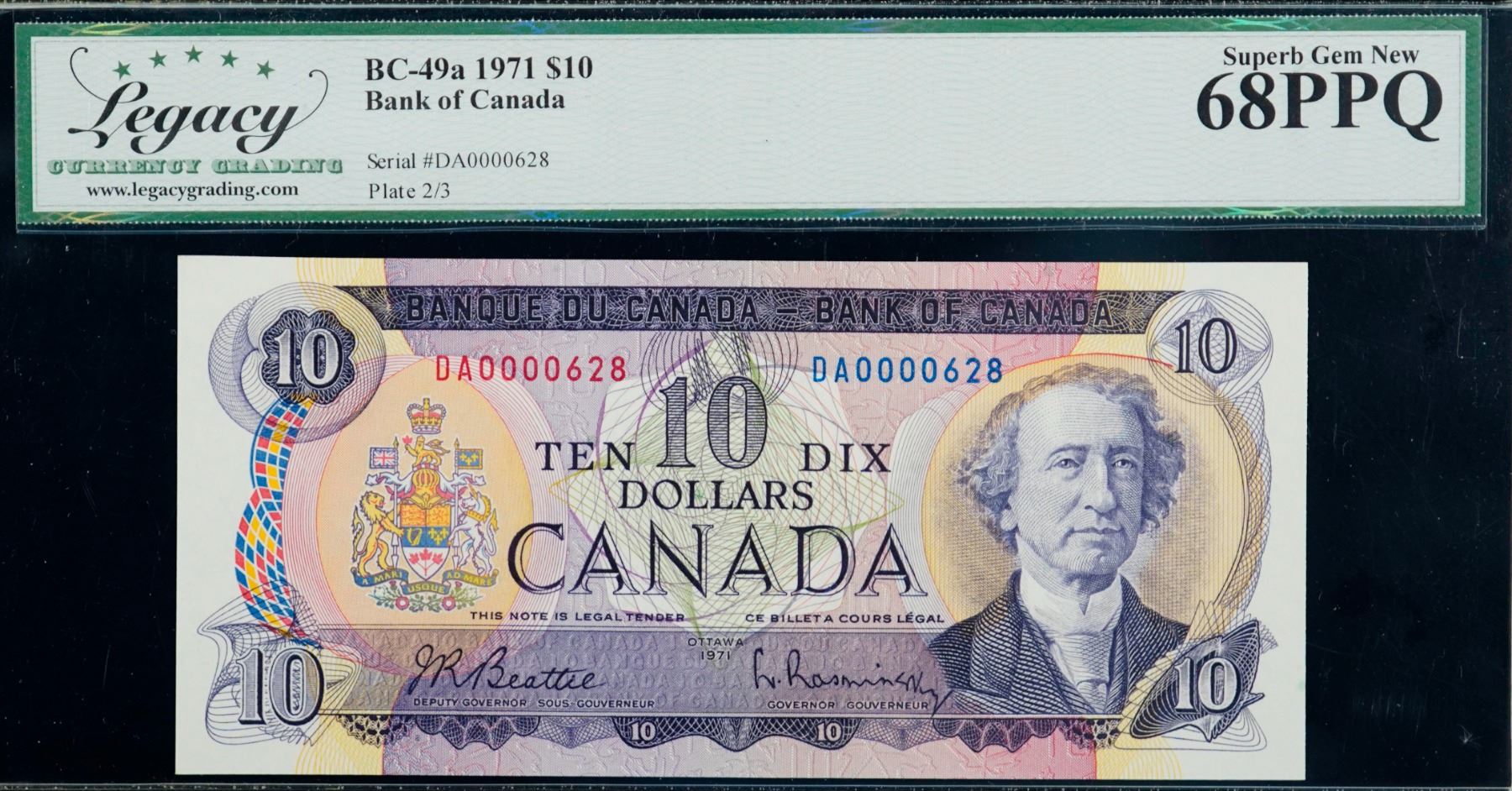 Low Number; 1971 $10 BC-49a DA0000628, Legacy Currency Grading Superb Gem Uncirculated-68PPQ