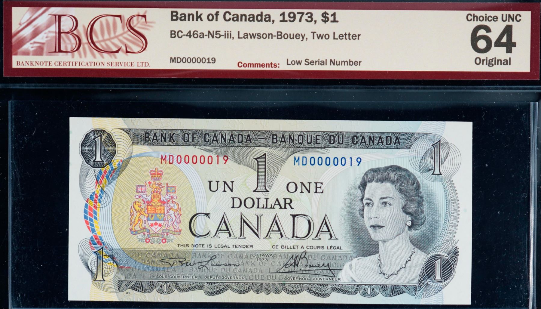Low Number; 1973 $1 BC-46a-N5-iii #MD0000019 BCS Choice Uncirculated-64 Original