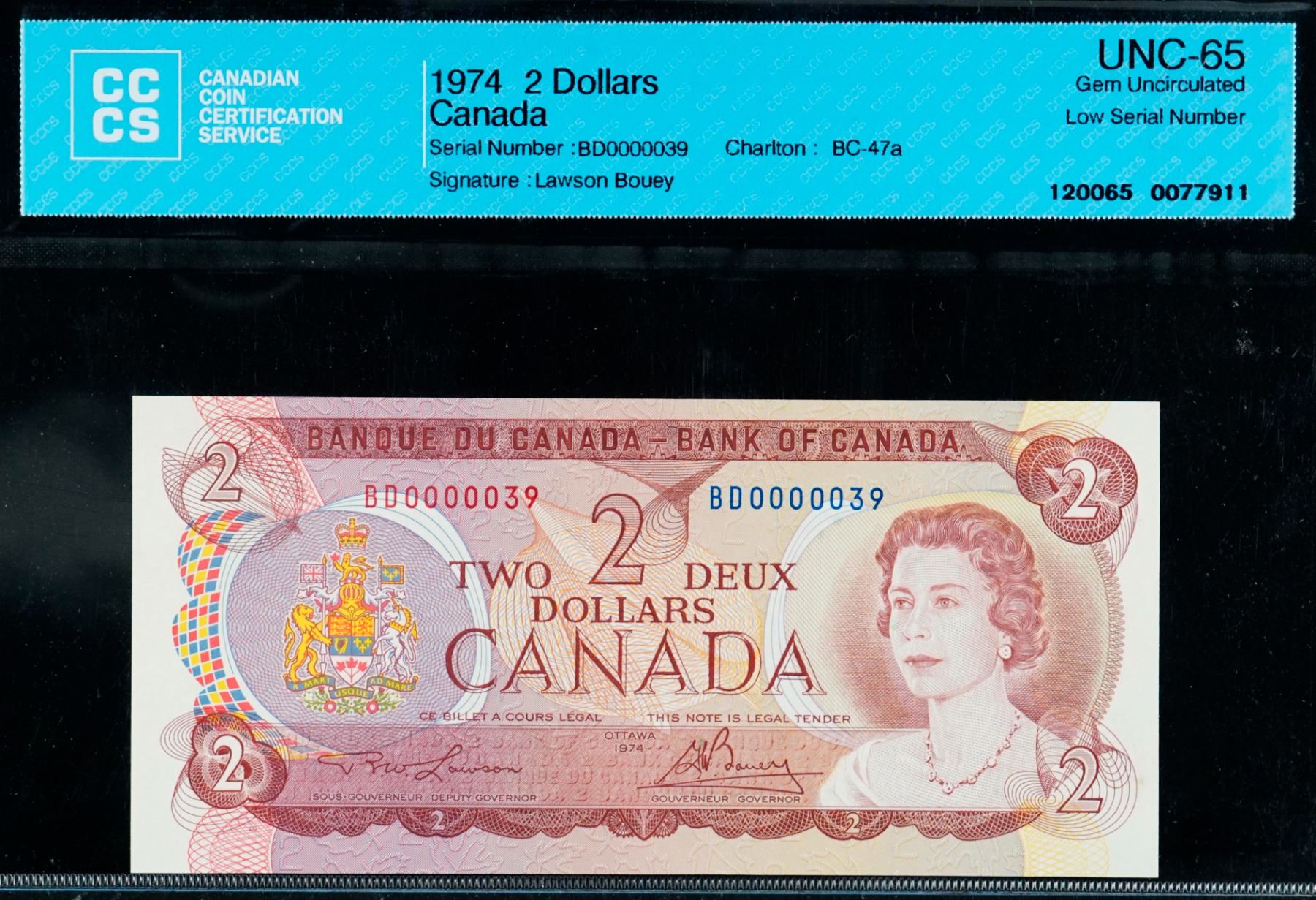 Low Number; 1974 $2 BC-47a #BD0000039, CCCS Gem Uncirculated-65.