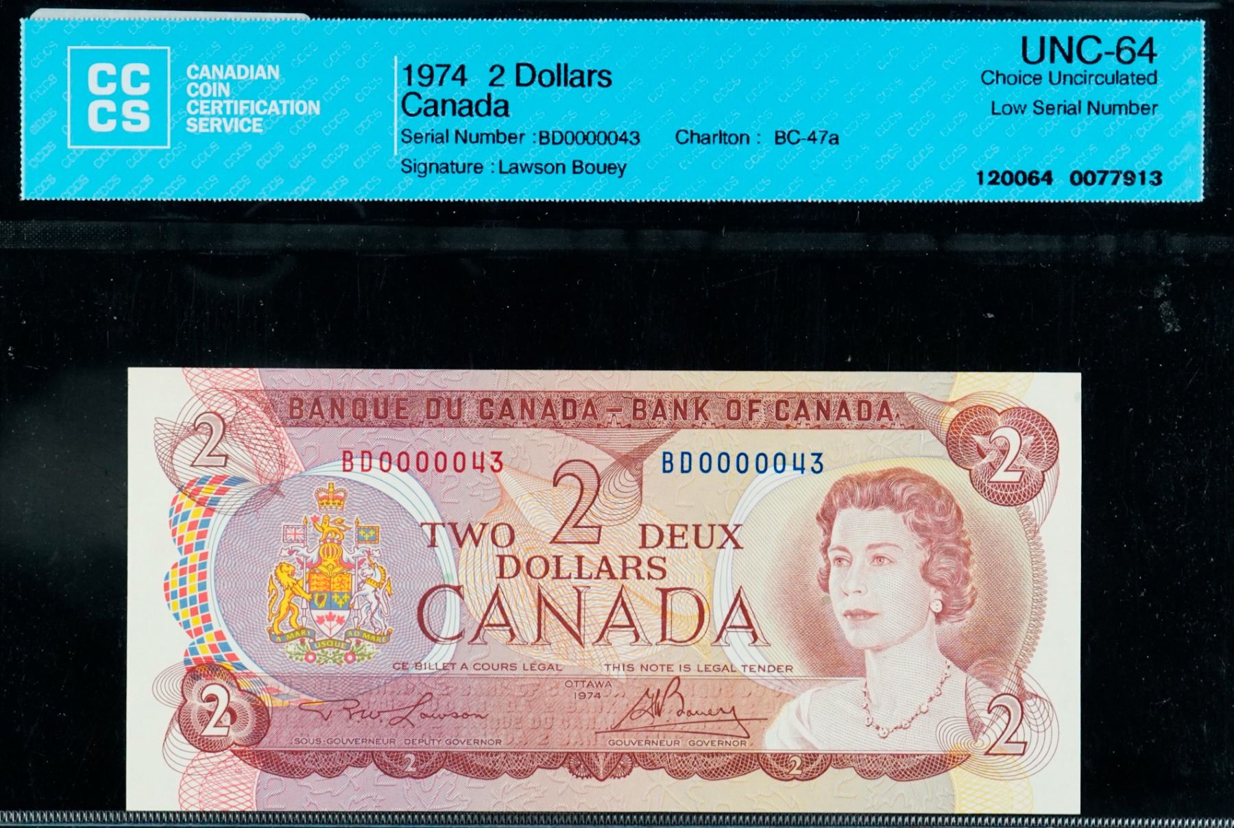 Low Number; 1974 $2 BC-47a #BD0000043, CCCS Choice Uncirculated-64.