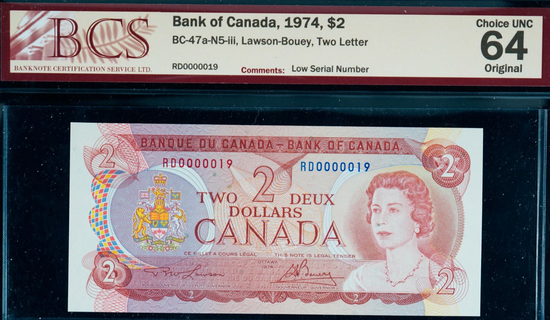 Low Number; 1974 $2 BC-47a-N5-iii #RD0000019 BCS Choice Uncirculated-64 Original