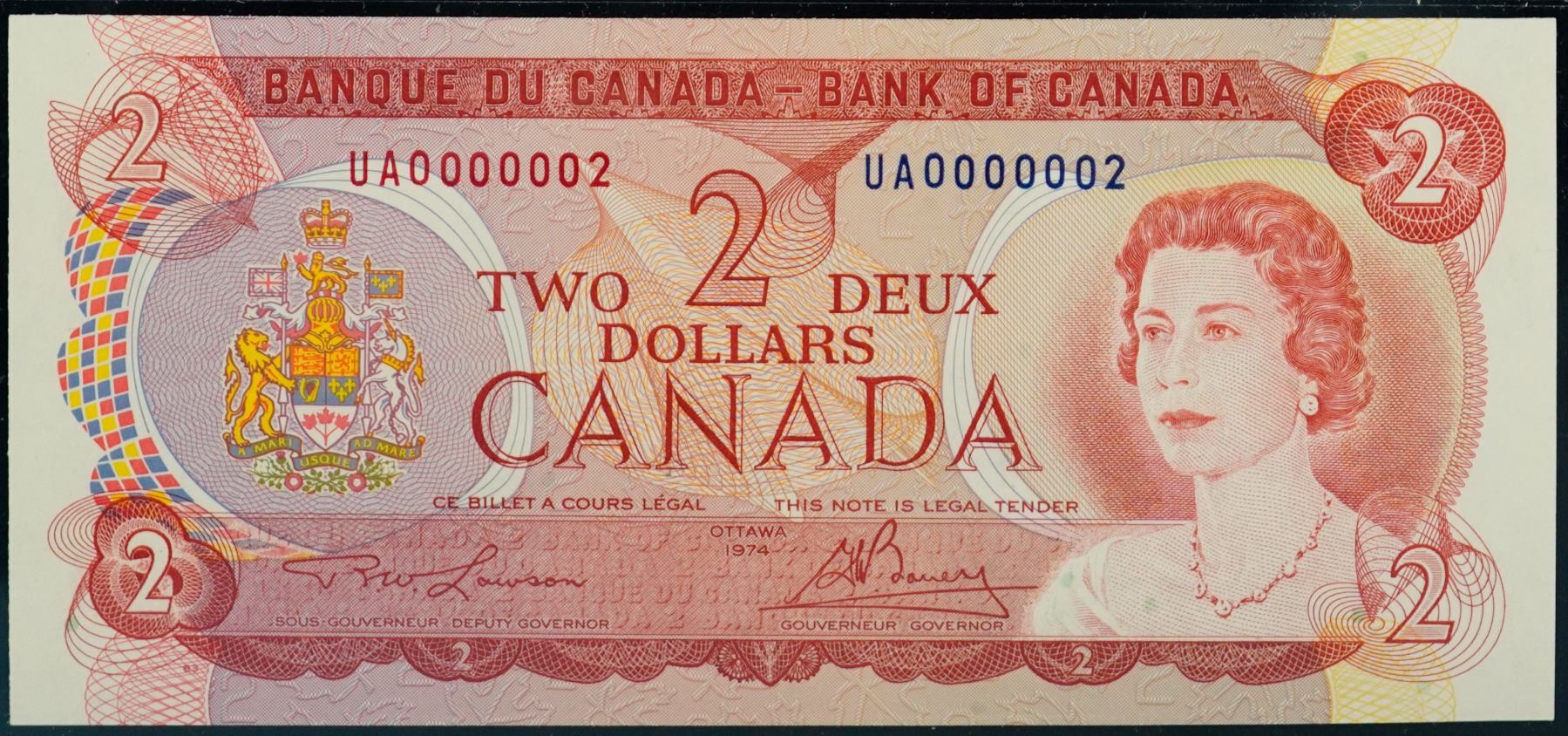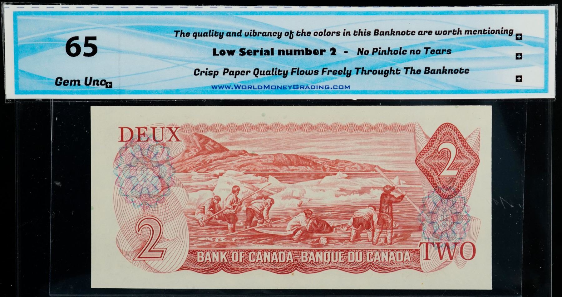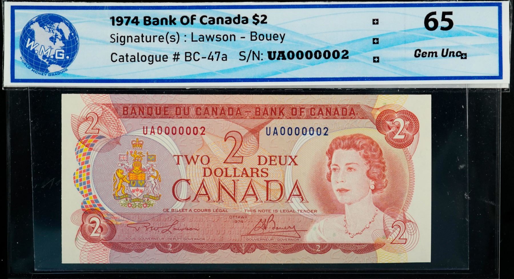 Low Number; 1974 $2 BC-47a #UA0000002 WMG Gem Uncirculated-65. This is a pristine issue with great eye appeal, good margins and superb embossing.