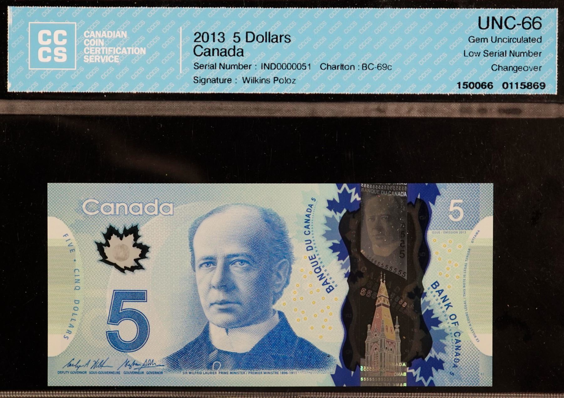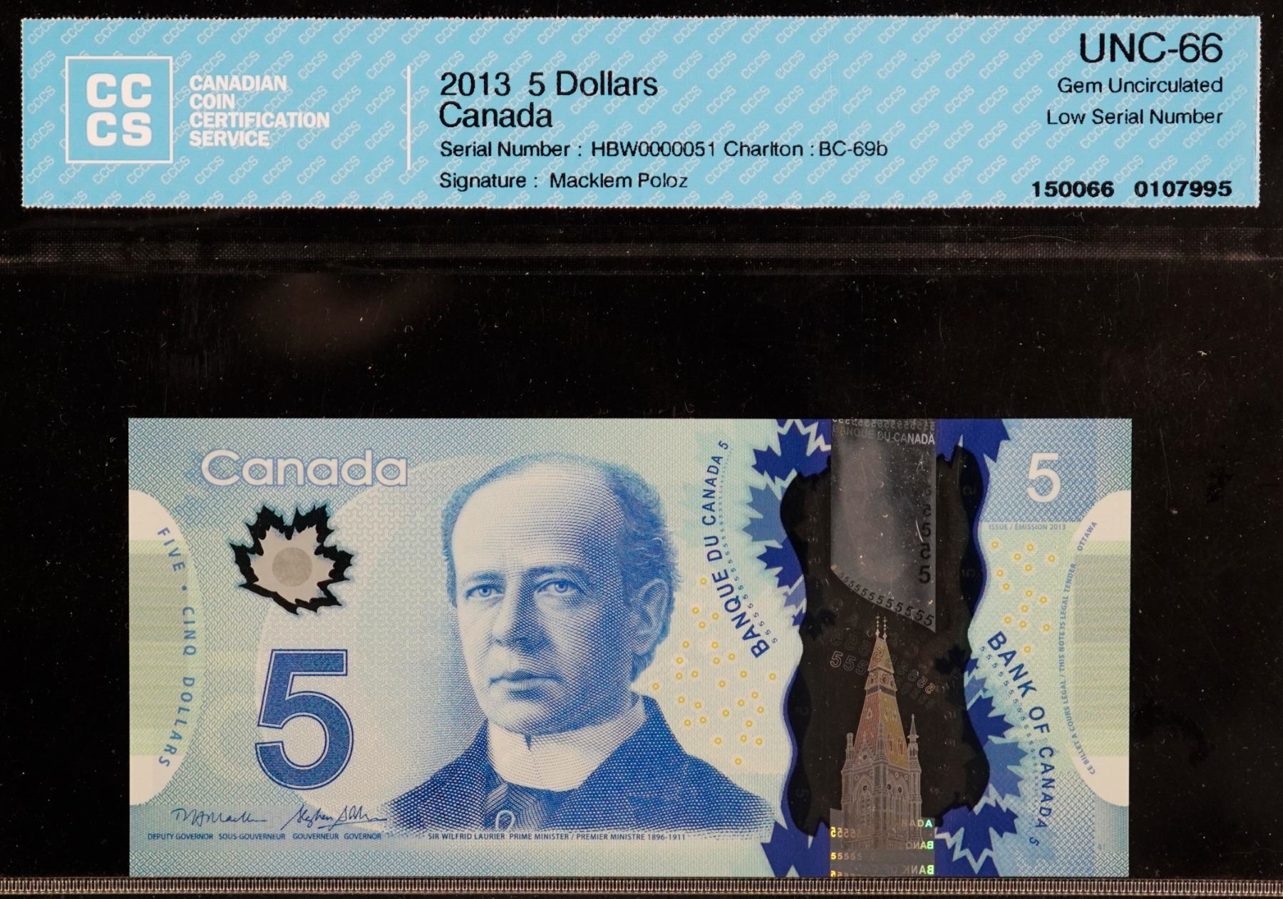 Low Number & Matching Pair; 2013 $5 BC-69c IND0000051/HBW0000051 Both notes CCCS Superb Gem Uncirculated-66