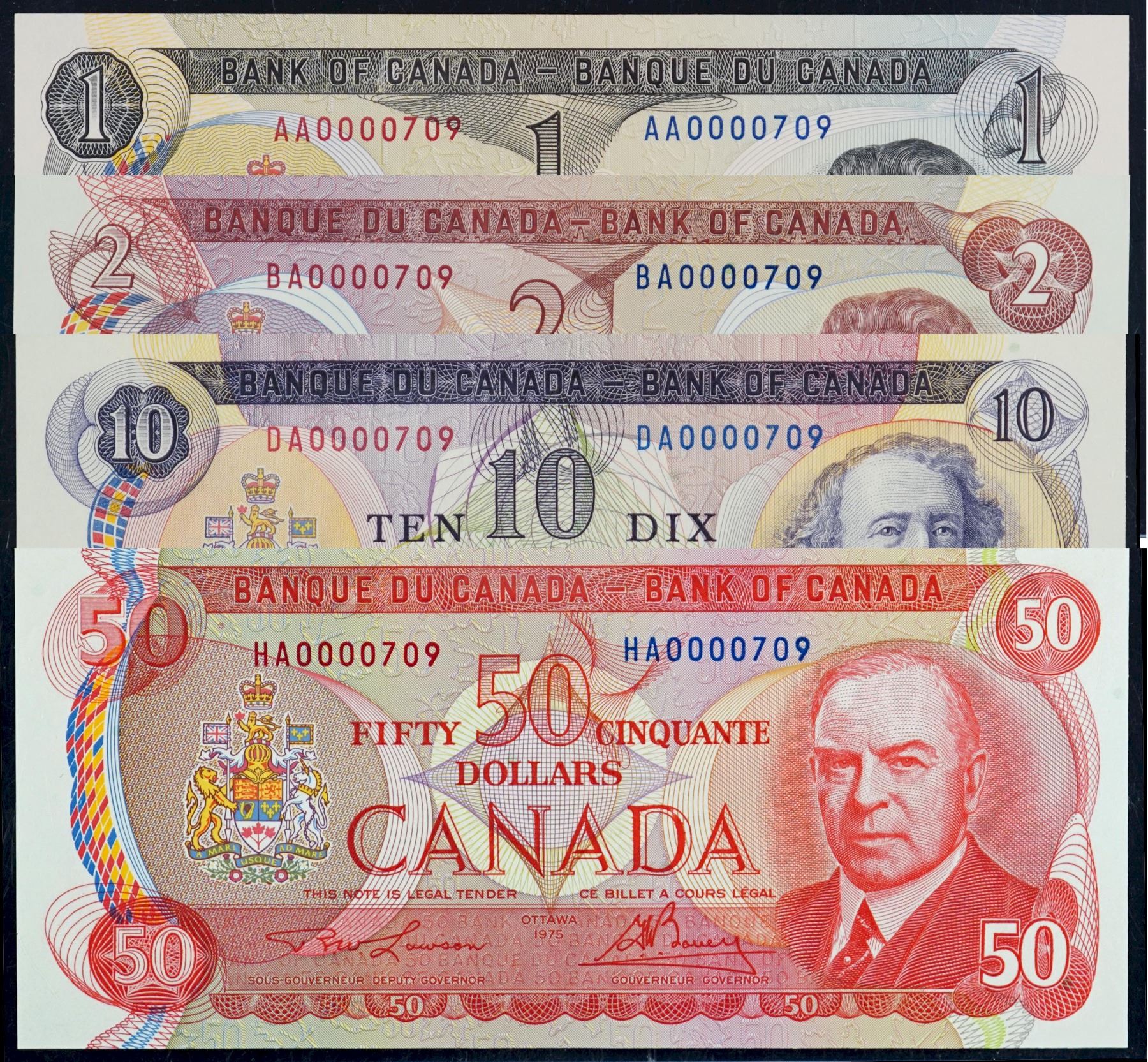Low Number; Partial set 1971-1975 $1, $2, $10, $50 0000709 All 4 notes Legacy Currency Grading Choic