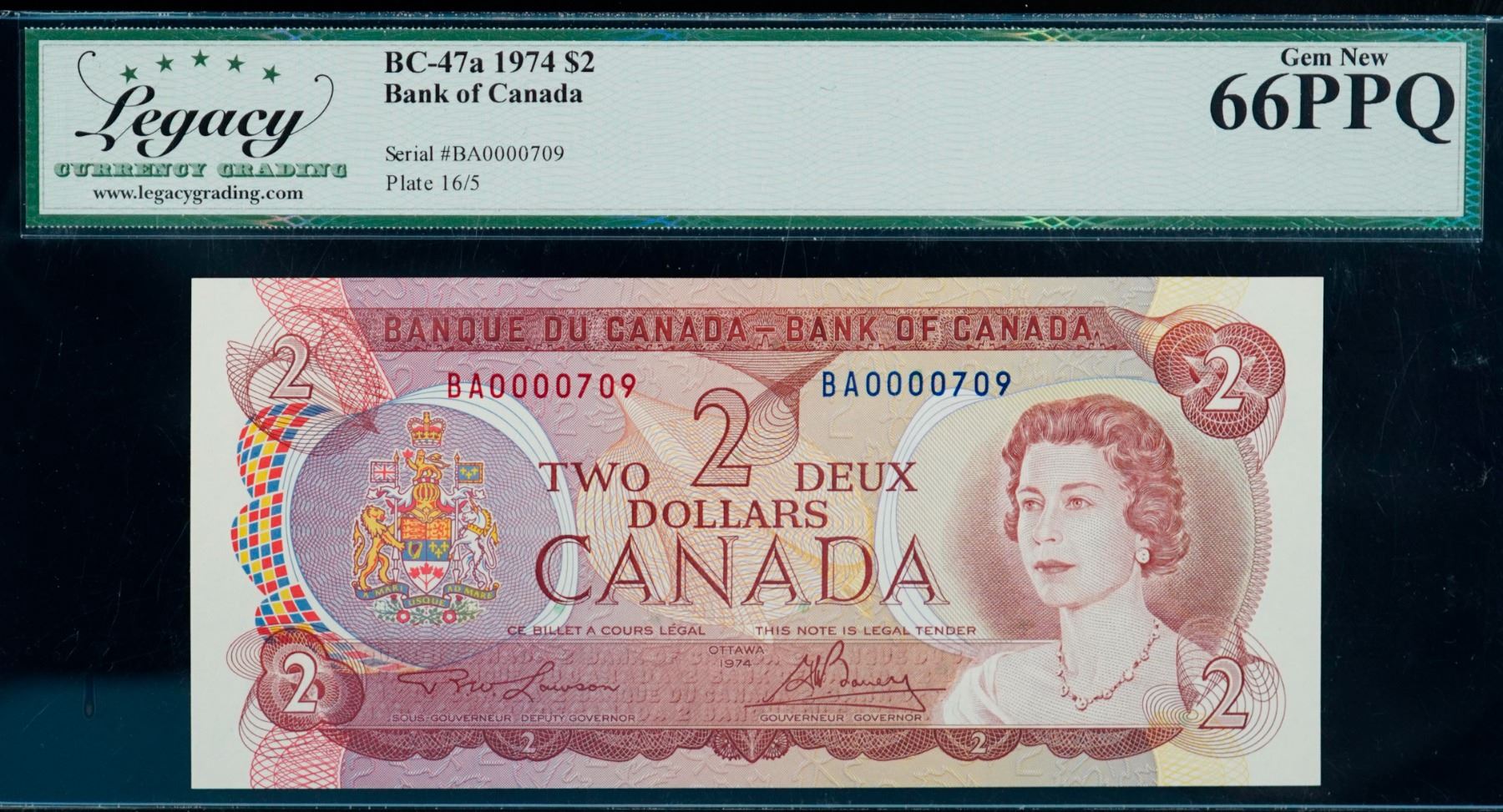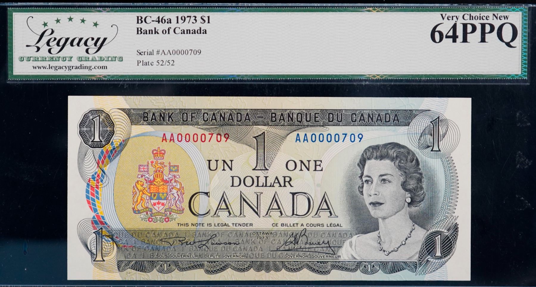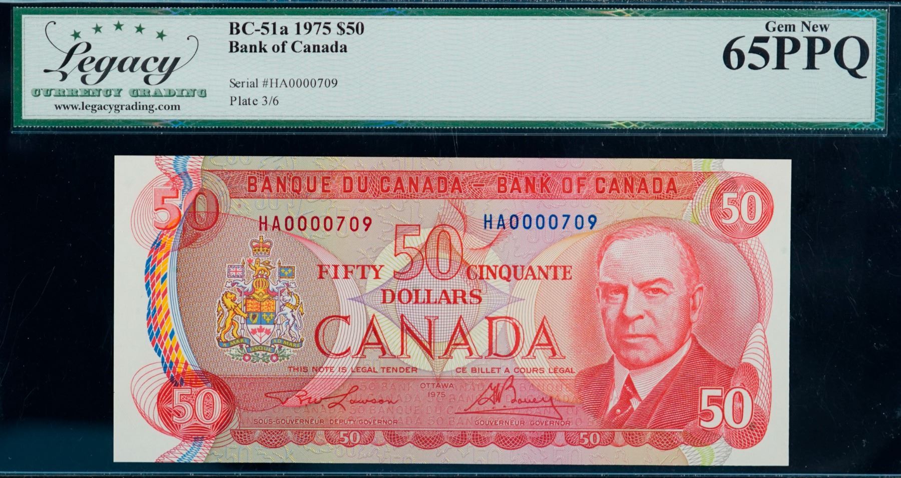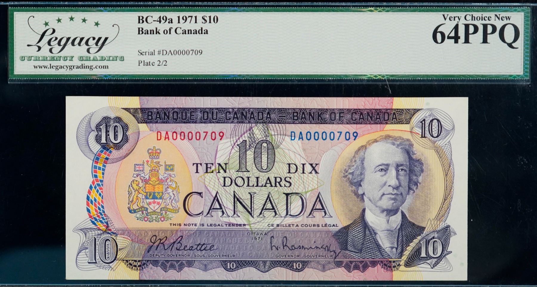 Low Number; Partial set 1971-1975 $1, $2, $10, $50 0000709 All 4 notes Legacy Currency Grading Choice Uncirculated-64PPQ-to UNC 66PPQ